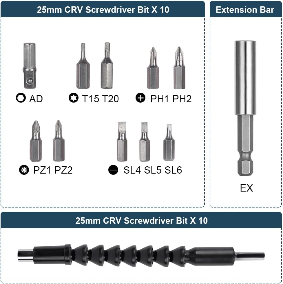 - 【VIEL ZUBEHÖR】 10 Zubehör, einschliesslich einer Vielzahl von Bohrern, sind für fast alle Arten von Schrauben geeignet. Es kann nicht nur als Schraubendreher verwendet, sondern auch an einer elektrischen Bohrmaschine befestigt werden. Der Winkel