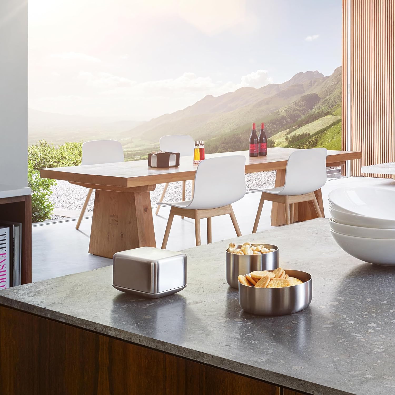 - Hochwertiges Material: Die Butterdose BASIC besteht aus mattiertem und poliertem Edelstahl, was nicht nur für eine langlebige Haltbarkeit, sondern auch für ein edles Erscheinungsbild sorgt.