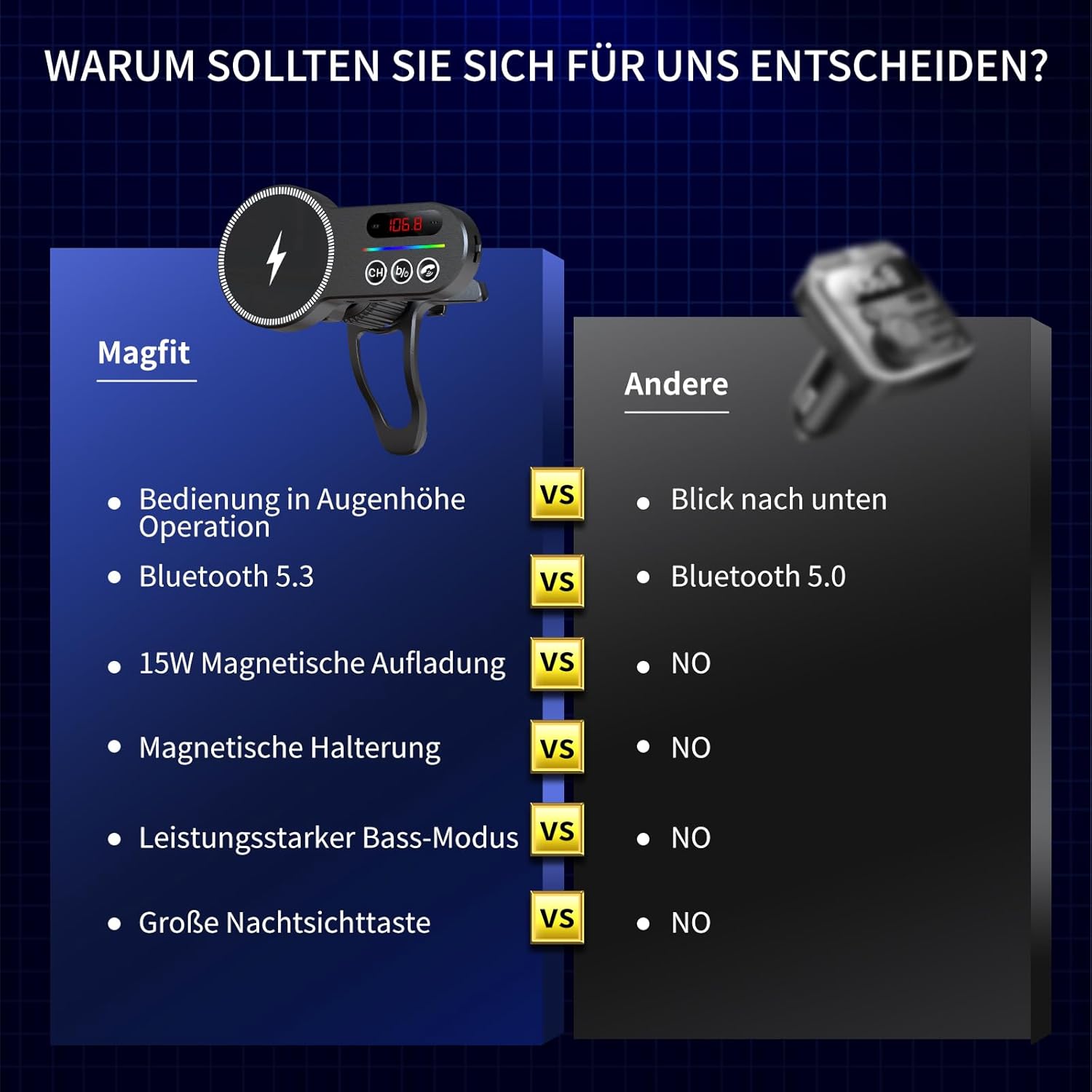 - Problemloses Aufladen: Unser Magift Bluetooth FM Transmitter bietet blitzschnelle Ladegeschwindigkeiten von bis zu 15W und sorgt dafür, dass Ihre Geräte während der Fahrt einsatzbereit sind.