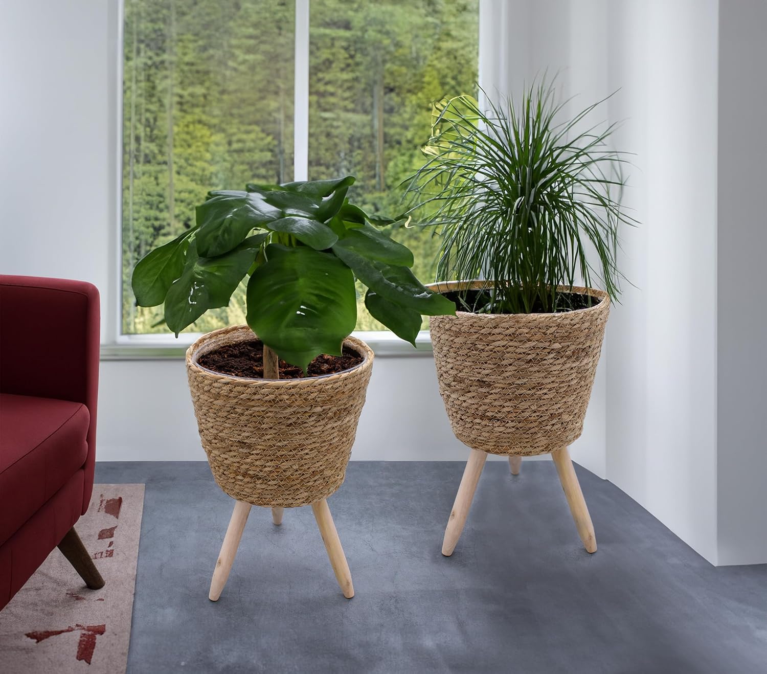 Blumenständer aus Stroh innen mit Folie 2er Set - Ø 26 und 20 cm - Rattan Pflanzenständer mit 3 Holz