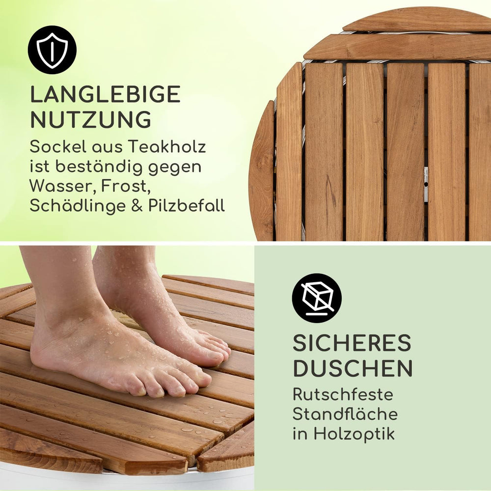 - EINFACHE REINIGUNG: Teak ist besonders unempfindlich gegenüber Schädlingen, Pilzbefall, Frost und Wasser, zusätzlich lässt es sich besonders einfach reinigen. Sommer, Sonne, Abkühlung. Mit der blumfeldt Cool Breeze Campingdusche Warmwasser hält erfrischender Badespass auch im kleinsten Garten seinen Einzug.
