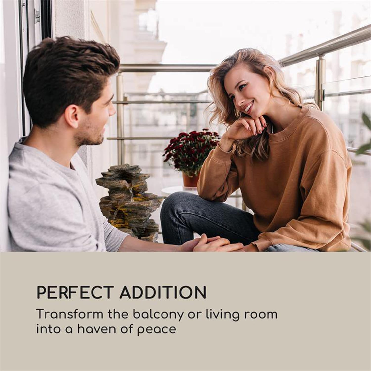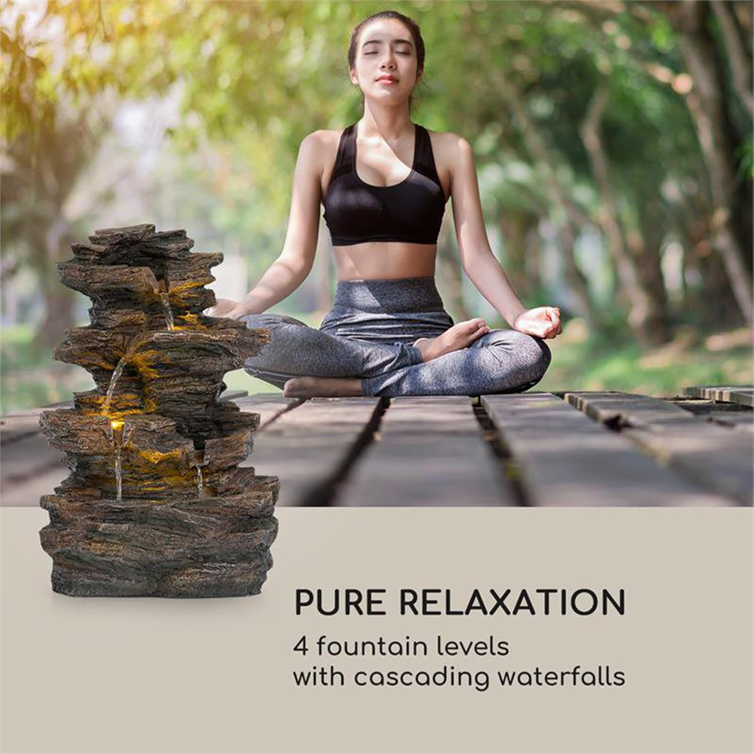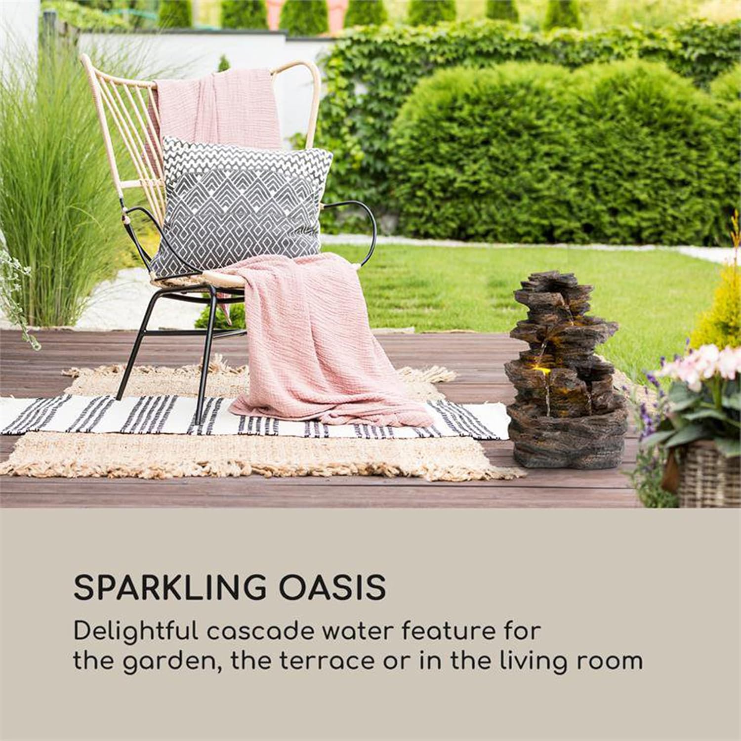 - ENTSPANNEN UND GENISSEN: Sanft plätschernd ergiesst sich das Wasser im stetigen Schwall über die vier Stufen des Brunnens. Und dank des Arbeitsprinzips im LoopFlow Concept ist dafür kein Wasseranschluss oder Nachfüllen nötig, die Mini-Pumpe hält das eingefüllte Wasser in stetigem Umlauf.