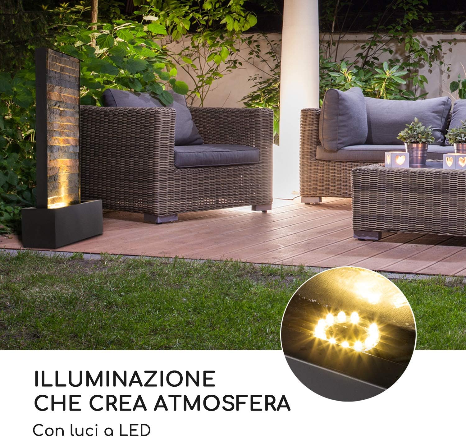 - STIMMUNGSVOLL: Von zwölf LEDs stimmungsvoll beleuchtet plätschert das Wasser in stetem Strom die senkrechte Fläche hinab und sorgt so für meditative Entspannung. Bringt Erholung in Garten oder Wohnung: der Raincastle Gartenbrunnen von Blumfeldt.