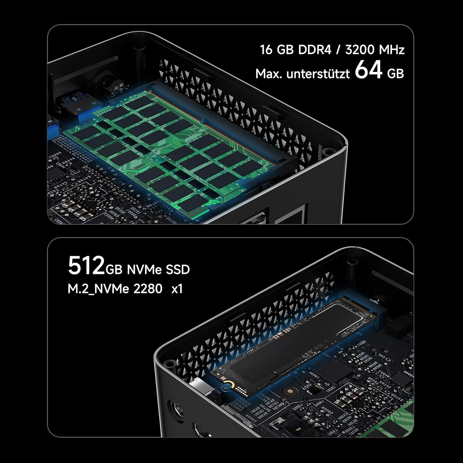 - 【16 GB DDR4 + 512 GB NVMe SSD】 Der BMAX B5APro Mini computer ist mit 16 GB SO-DIMM DDR4 RAM (3200 MHz) und 512 GB NVMe SSD ausgestattet, was schnellen Datenzugriff und ausreichend Speicherplatz bietet. Die 7-nm-Prozessleistungsfreigabe ist stabiler