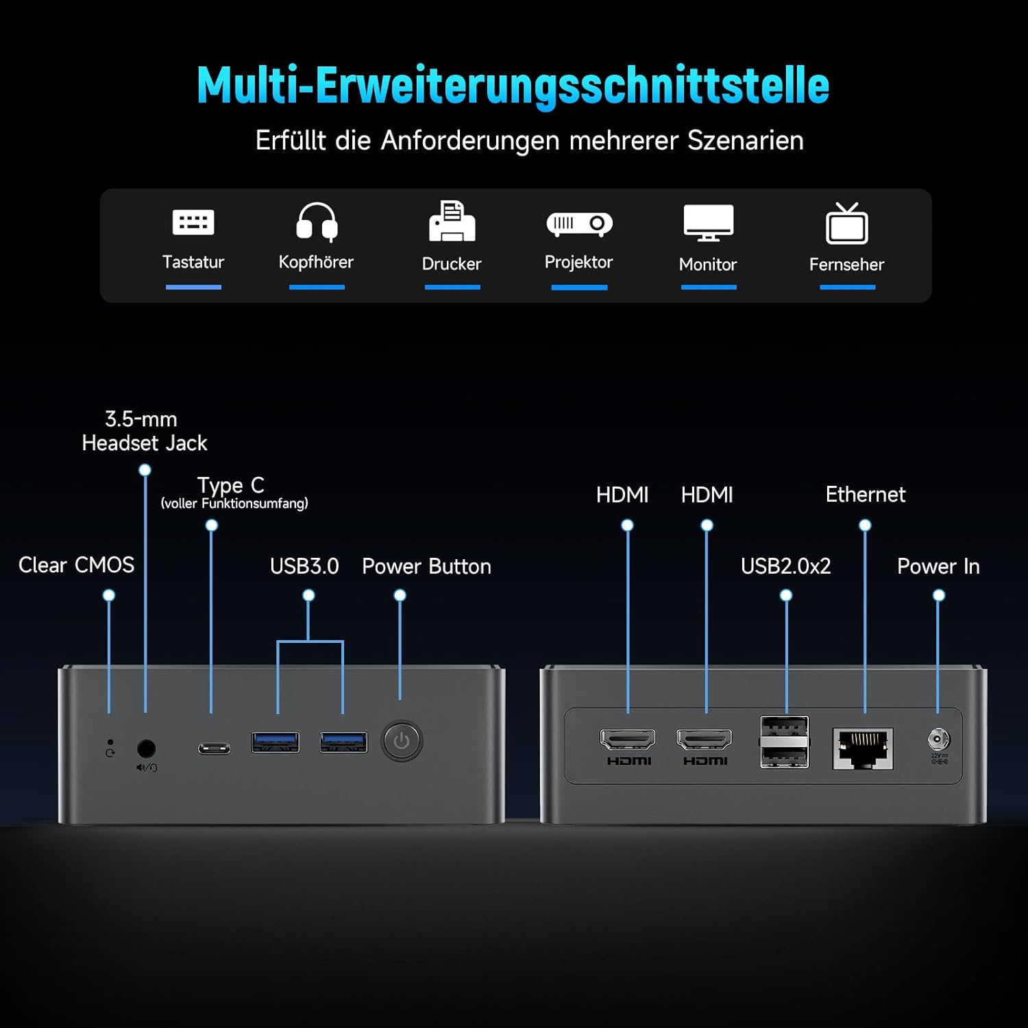 - 【16GB DDR4 + 1 TB SSD】Der Mini computer verfügt über 16 GB DDR4-RAM (2666 MHz) für müheloses Multitasking und eine 1 TB SSD für ultraschnelle Starts, schnellen Dateizugriff sowie reichlich Platz für Apps, Medien und Dokumente. Mit einem