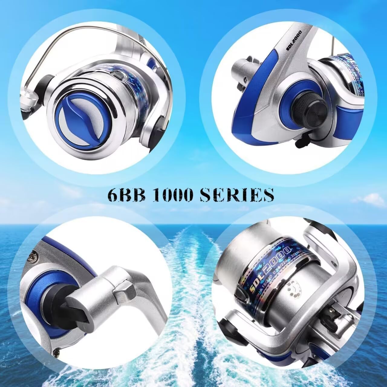 - Angelrolle (mit Linie 3 # 70-80 Meter): 6 Kugellager, Übersetzungsverhältnis der Serie 1000 5,1: 1 Austauschbarer Klappgriff links / rechts. Griff links rechts austauschbar. Farbe: regelmässig blaue Farbe Spulenfarbe, schwarzer Griff und Hauptkörper.