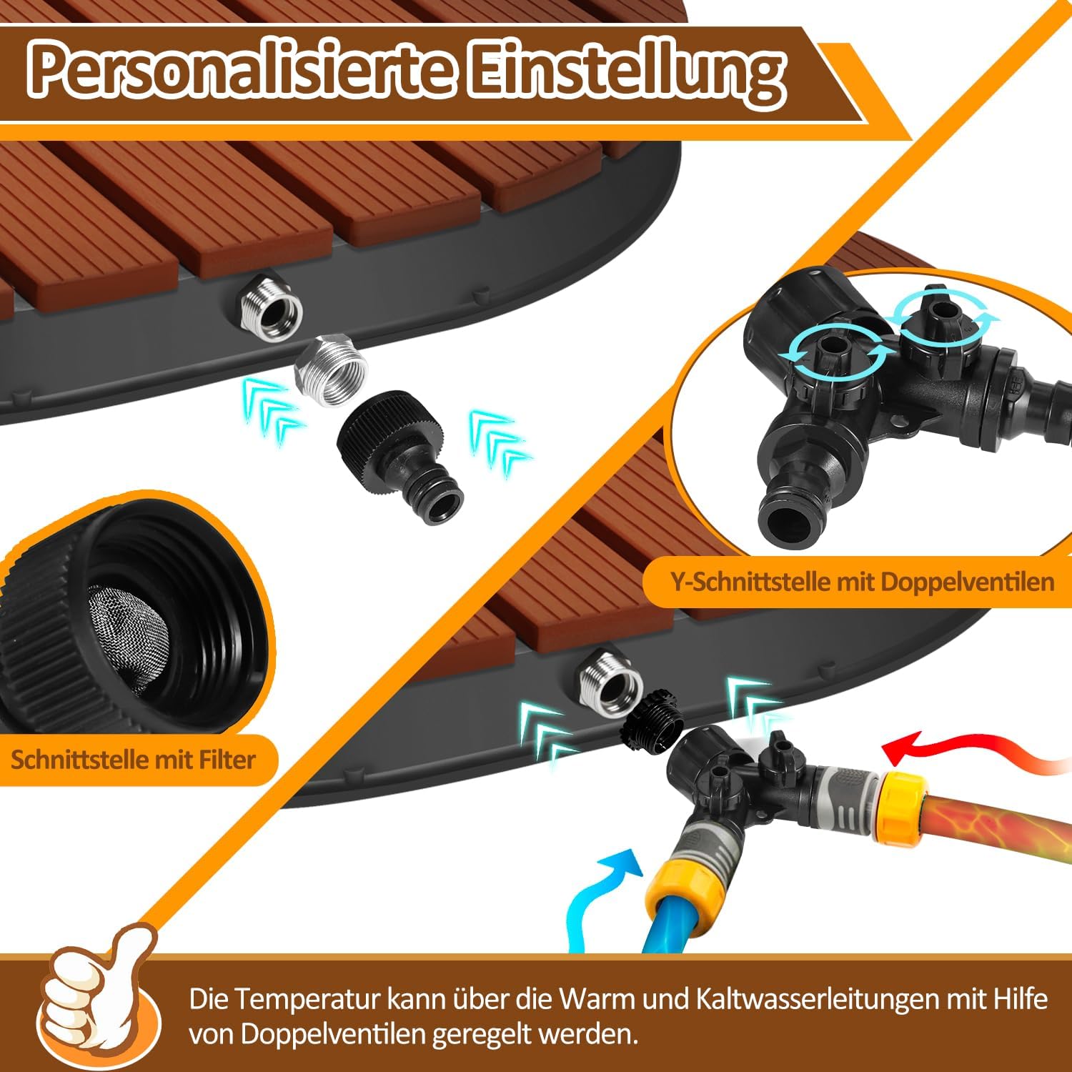 - 【Individuell einstellbar】:Mit integrierten Fussrollen ermöglicht die Aussendusche eine mühelose Höhenverstellung bis zu 4 Metern; die Dual-ventil Schnittstelle erlaubt die Temperaturregulierung für kaltes und warmes Wasser, um persönlichen