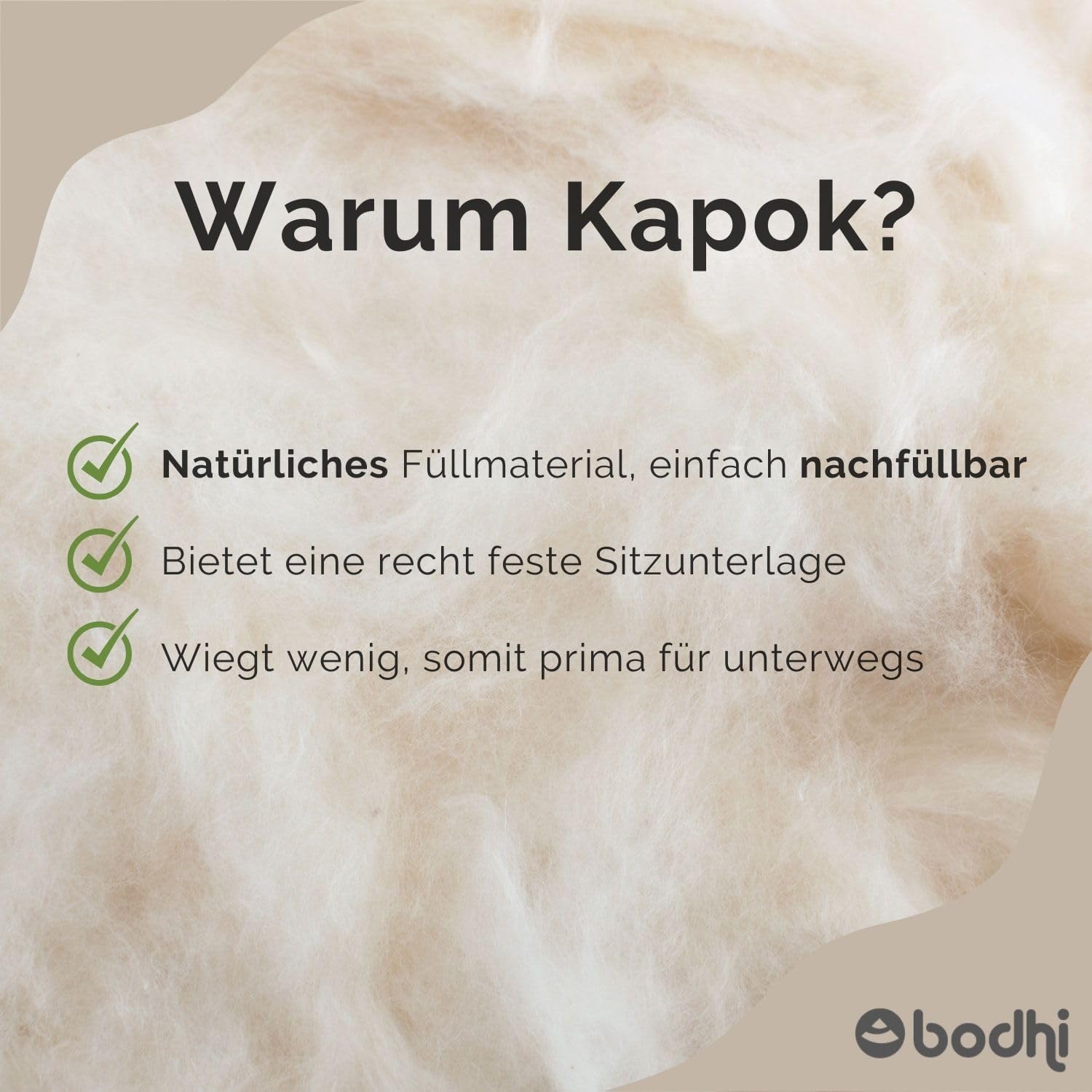 - KAPOK FÜLLUNG - Im Gegensatz zu der Dinkelspelz Füllung sind diese Yogakissen mit feinen Fasern des Kapokbaums befüllt. Dank der Kapokfüllung des Kissens ist dieses deutlich weicher und leichter. Die Füllung bietet dir ein atmungsaktives und Wärme
