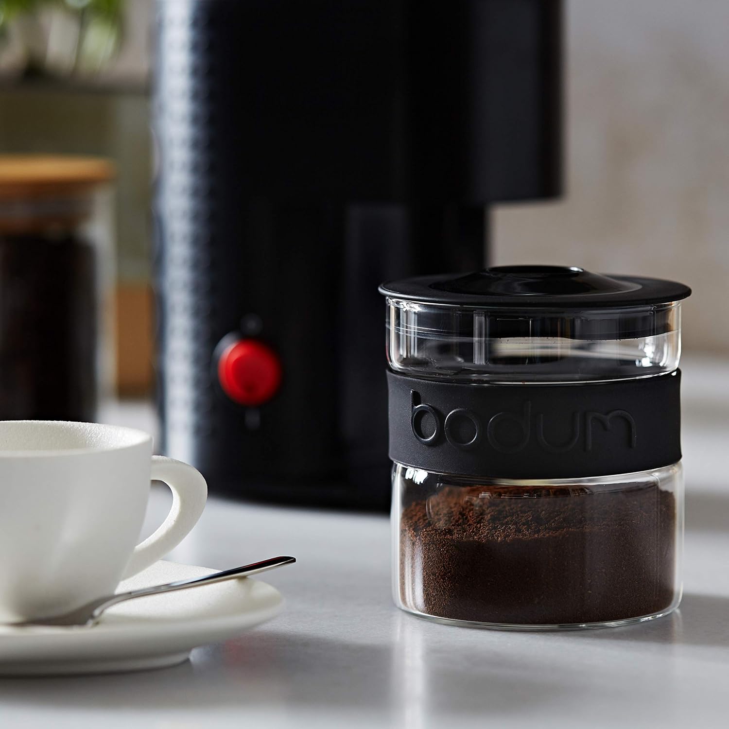 - Auffangbehälter aus antistatischem Borosilikatglas, damit sich das feine Kaffeepulver nicht versehentlich löst.