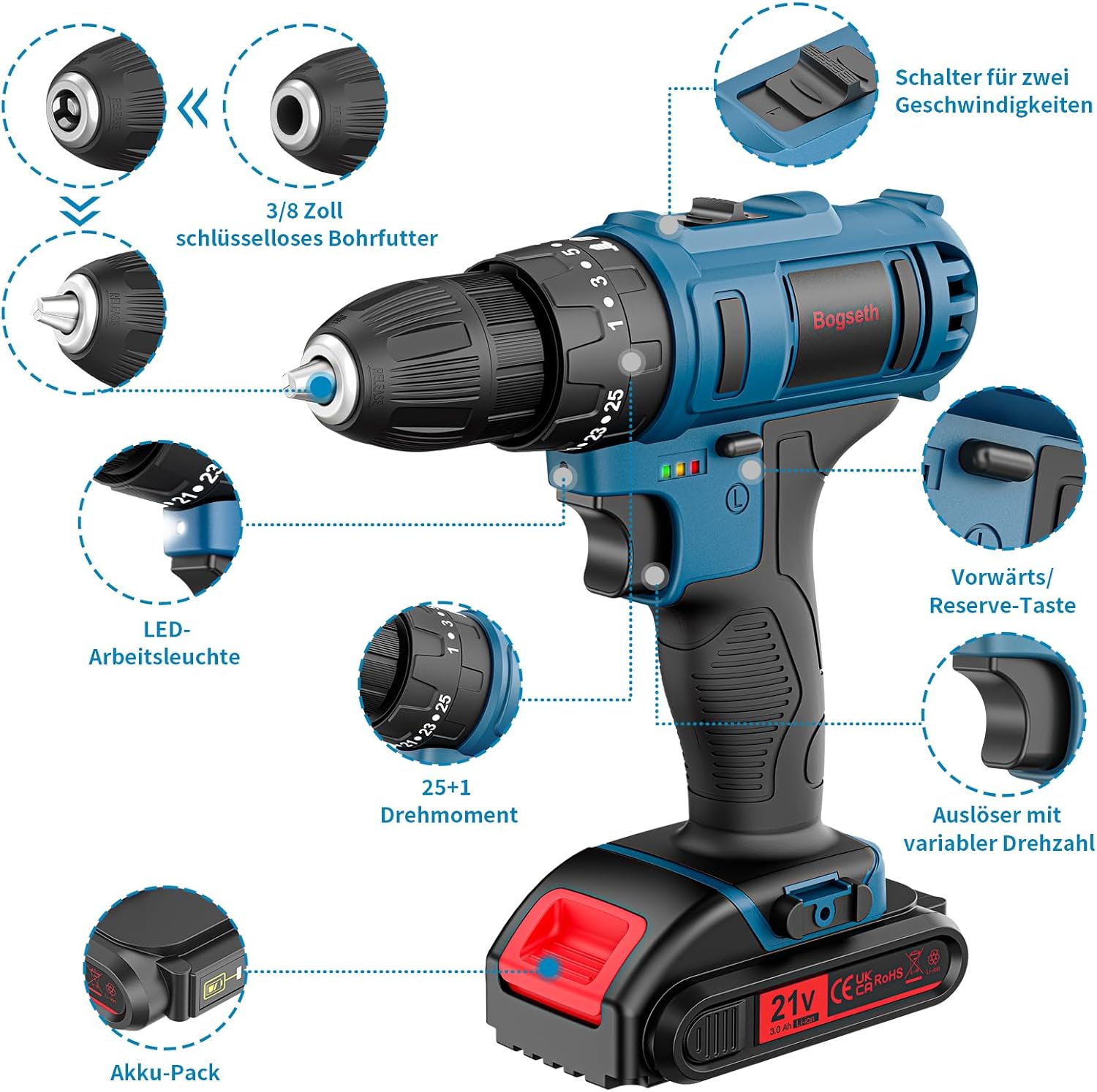 • 【10mm Auto Chuck, 25+3 Clutch & 2-Variable Speed】Bogseth 21V Akkuschrauber mit 10mm Schnellspannfutter bietet ausgezeichnete Bit-Retention. Ausgestattet mit 3-in-1 Arbeitsmodus (schraubendreher, Akkuschrauber und Schlagbohrmaschine). Dieser