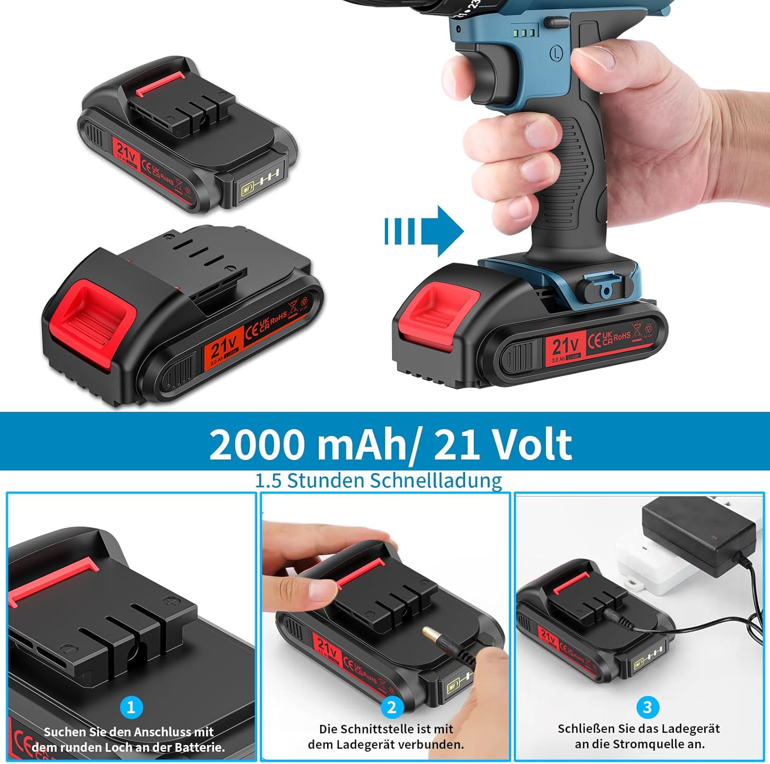 • 【Two 2000mAh Batteries & 1H Fast Charger】Bogseth hat grosse Fortschritte im 1.000-Ladezyklus-Test gemacht, der garantiert, dass jeder Bogseth Akku leistungsfähiger und langlebiger ist als andere. Unser kabelloser Bohrer wird von einem 21V, 2Ah Akku