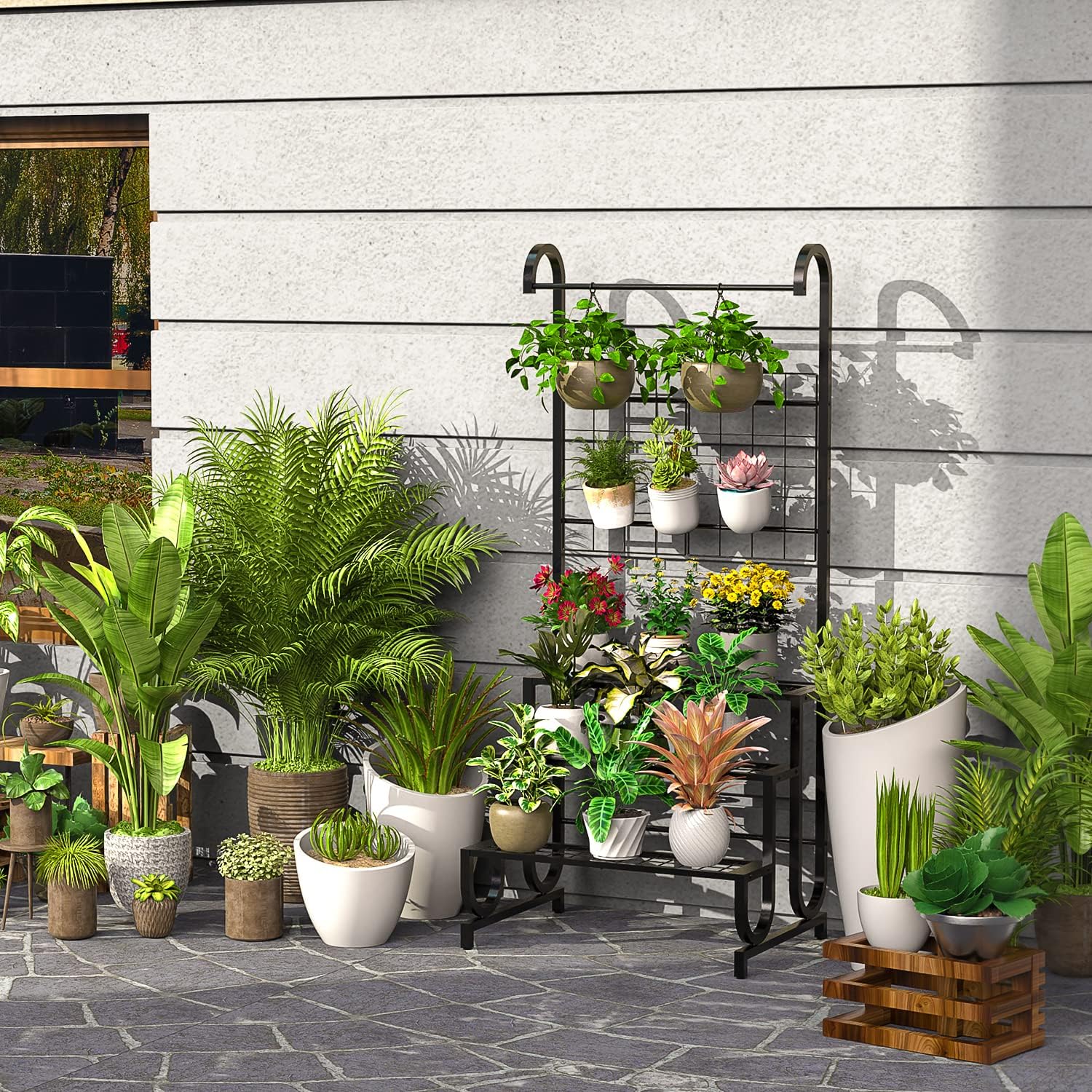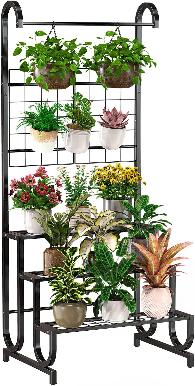 - Grosser Pflanzenständer mit hoher Kapazität - Die unteren 3 Regale dieses Pflanzenständers können Ihre grossen und schweren Pflanzgefässe halten. Der mittlere Teil ist ein Spalier, das je nach Bedarf auf die obere oder untere Ebene eingestellt