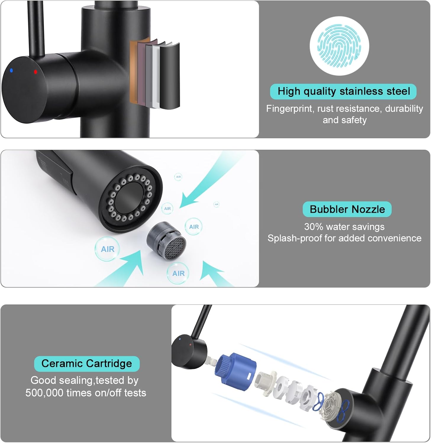 • 【Hochwertige Materialien】 Der Wasserhahn Küche ist aus Edelstahl 304 mit mattschwarz beschichtet (bleifrei, rostfrei)). Das Edelstahlmaterial ist stärker, der eine gute Korrosions- und Verschleissfestigkeit aufweist. Der Küchen Wasserhahn