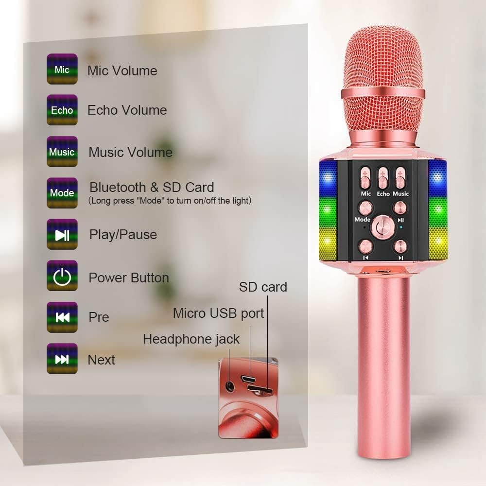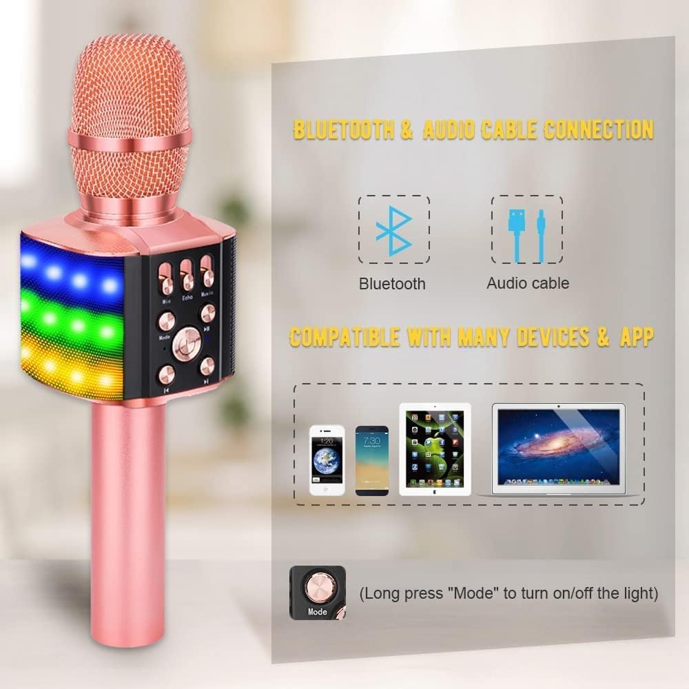 - 【4 in 1 Karaoke Maschine】 - Das drahtlose BONAOK-Mikrofon wird über Bluetooth mit Android, PC gekoppelt und kann als Karaoke-Mikrofon, Songrekorder und Bluetooth-Lautsprecher verwendet werden. Das Hinzufügen von schönen Lichtern an der Maschine