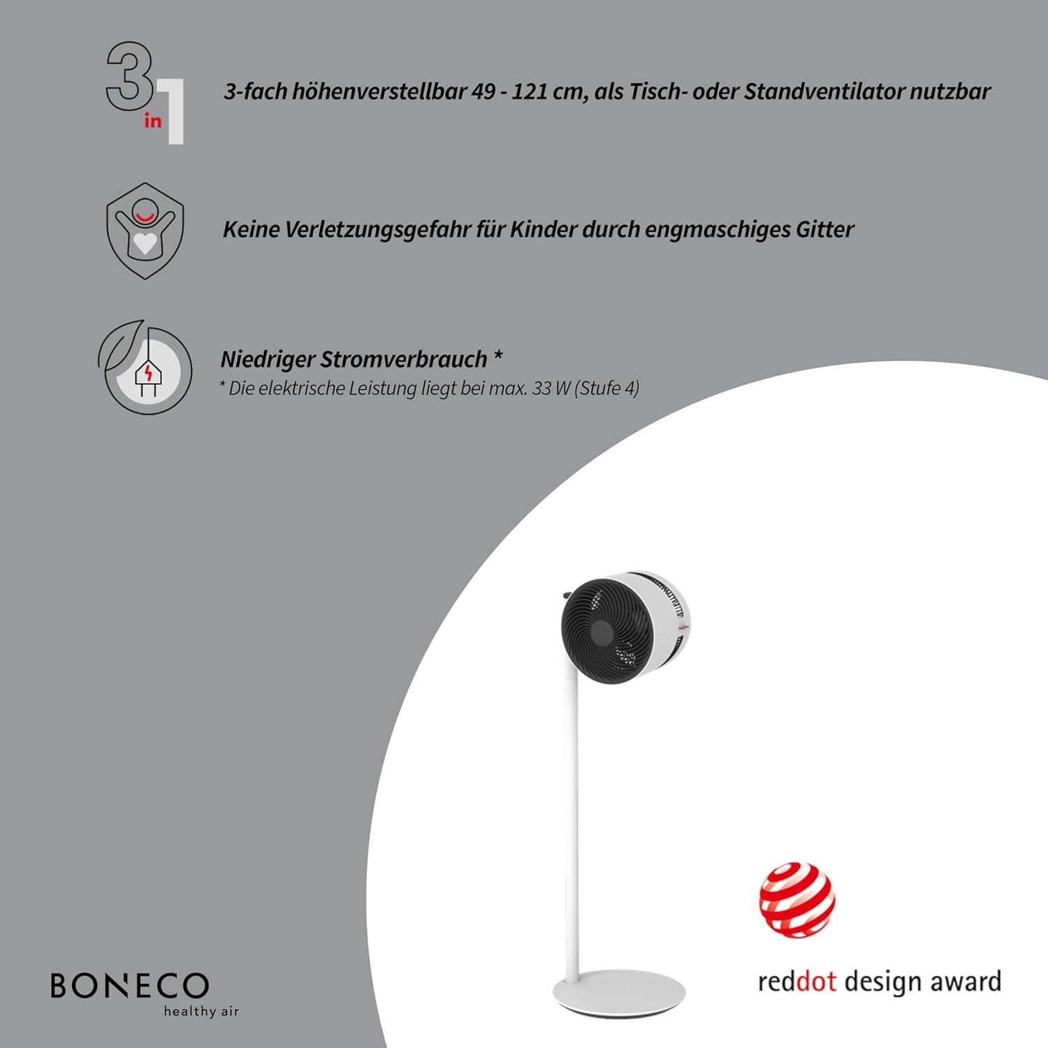 - Drehschalter mit 4 Leistungsstufen: An dem im Standfuss integrierten Drehschalter können die 4 Leistungsstufen des Lüfters einfach und unkompliziert eingestellt werden