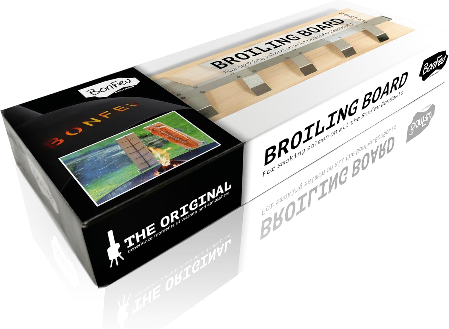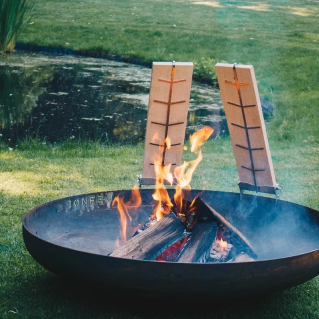 BonFeu Flammlachsbrett Braun - Holz - Stahl - Flammlachsbrett für Fisch Zubehör - 46x14x2 cm