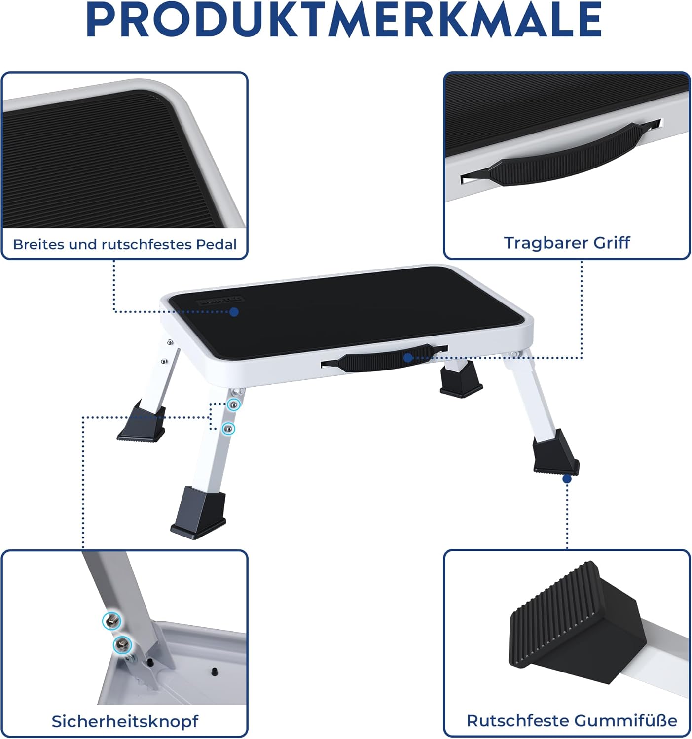 - STABILE KONSTRUKTION AUS STAHL BIS 150 KG BELASTBAR - Der Hocker besteht aus robustem, pulverbeschichtetem Stahl und bietet zuverlässigen Halt im Alltag. Mit seiner hohen Tragkraft von bis zu 150 kg eignet er sich hervorragend als Tritt für Kinder und