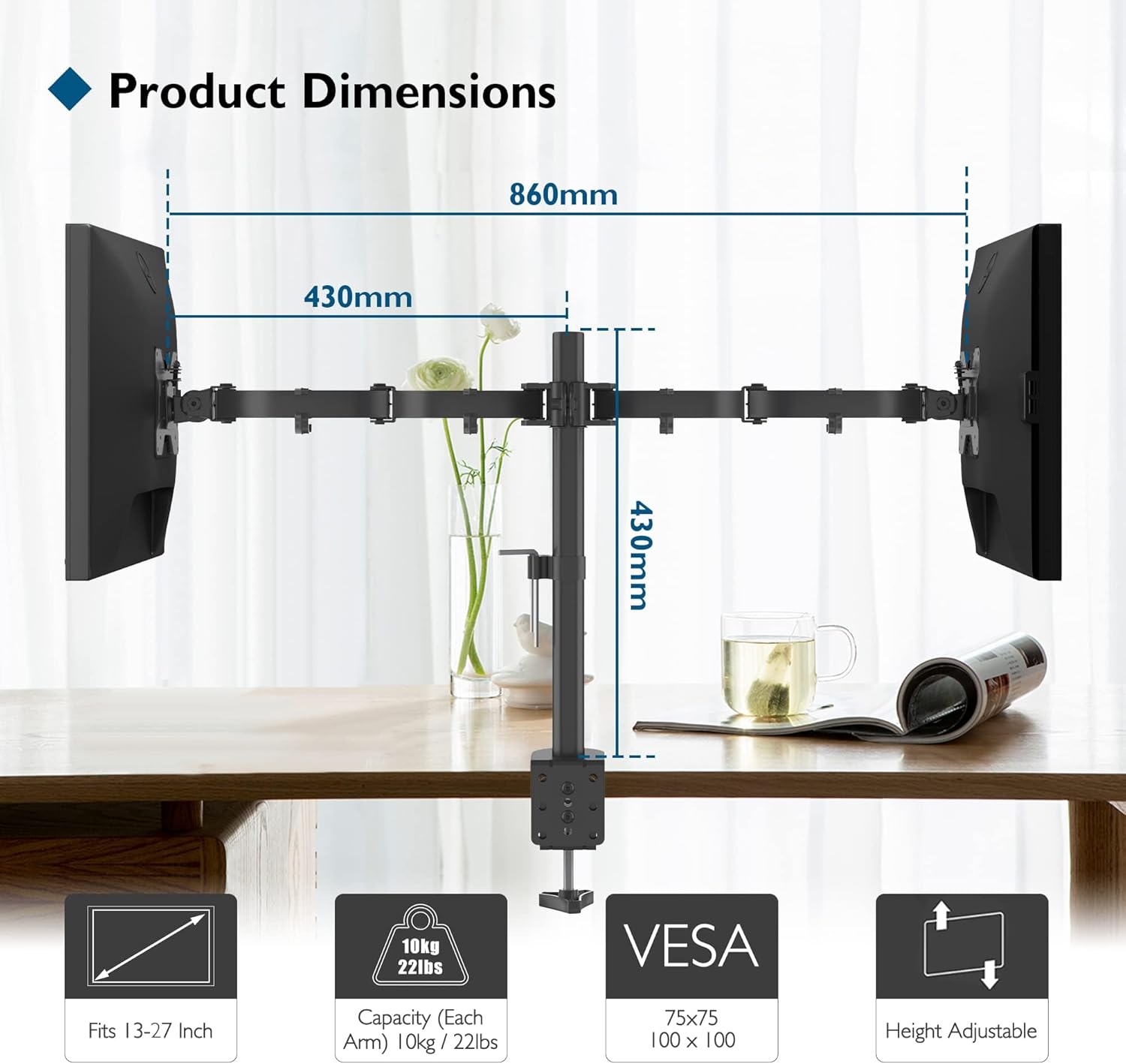 - Stabile Stahl-Doppelarm-Monitorhalterung: Montage von zwei Bildschirmen nebeneinander, um Platz auf dem Schreibtisch zu schaffen. Für zwei 13"-27" Fernseher oder Monitore mit einer maximalen Tragfähigkeit von 10 kg pro Arm.