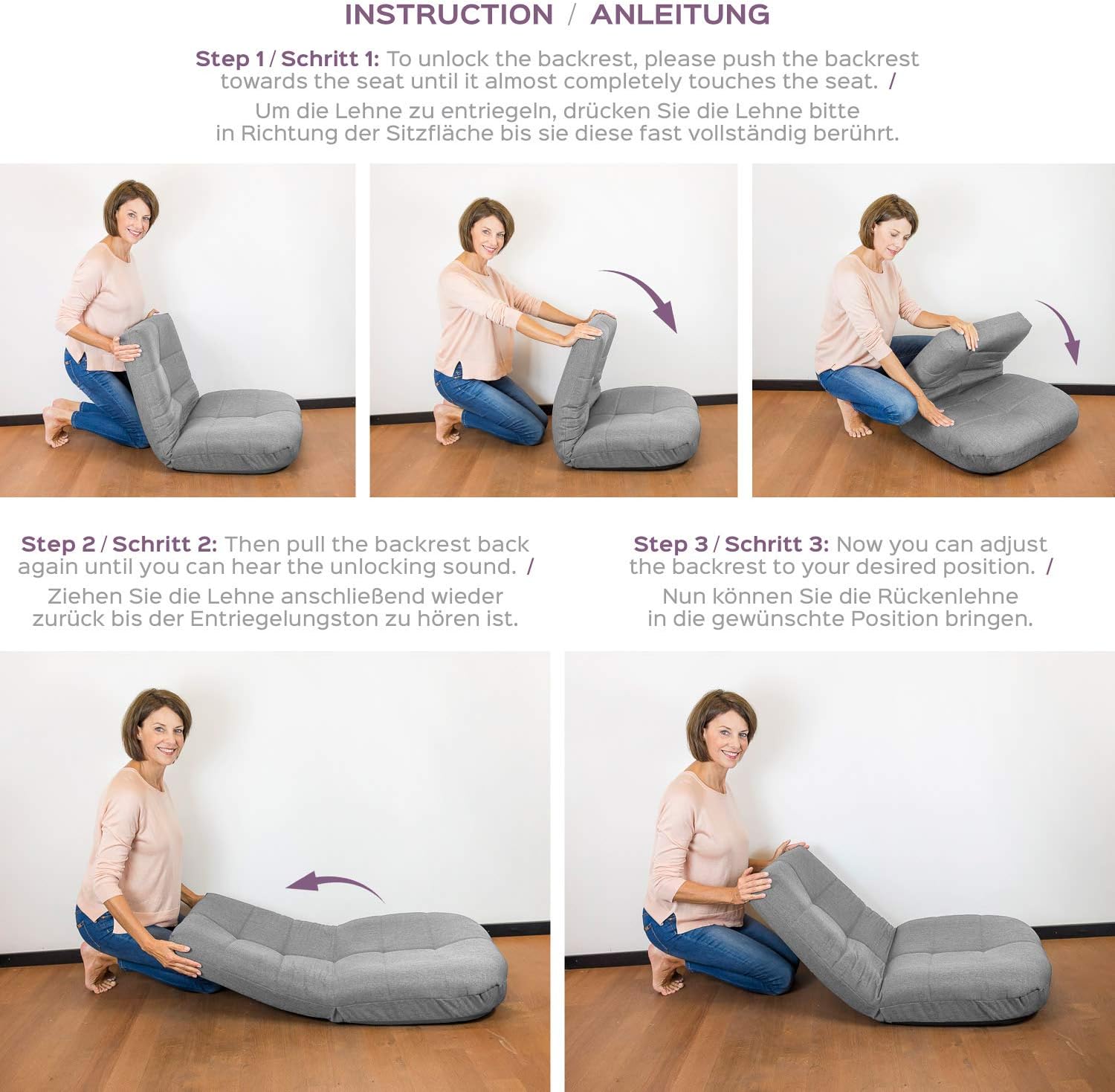 - BEQUEM: Das gepolsterte Bodensitzkissen passt sich dem Körper ideal an, wobei die Federung in der Sitzfläche für zusätzlichen Komfort sorgt. Die Lehne lässt sich in fünf Positionen fixieren.