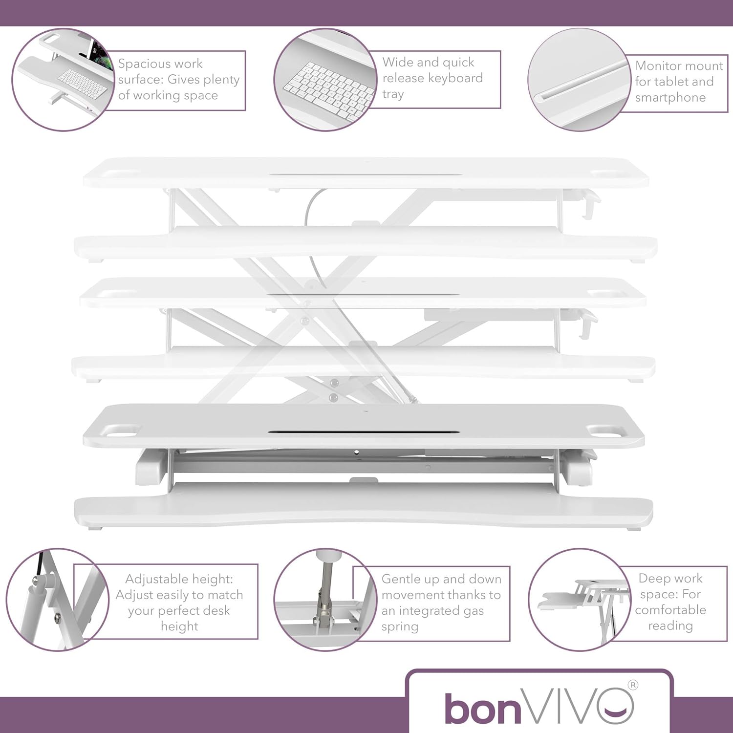 - Produktmasse: Der Stehtisch Aufsatz misst 95 cm x 40 cm und kann auf eine beliebige Höhe zwischen 11 cm und 50,5 cm eingestellt werden. Die Tastaturablage misst 94,5 cm x 30 cm.
