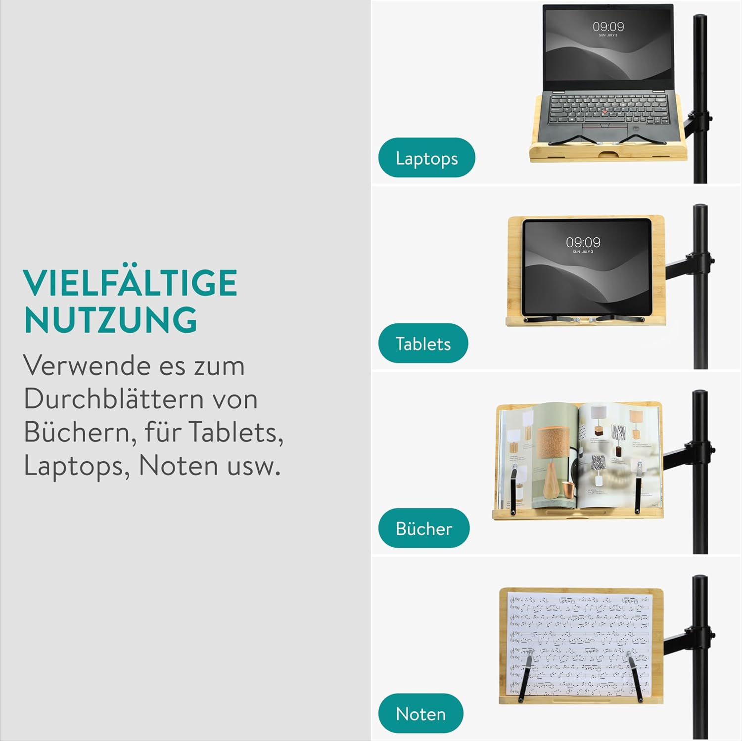 - Praktische Anwendung: Der Buchständer ist funktional und praktisch einsetzbar. Er kann für verschiedene Zwecke verwendet werden, z.B. zum Halten von Büchern, iPads, Laptops oder Notenblättern.