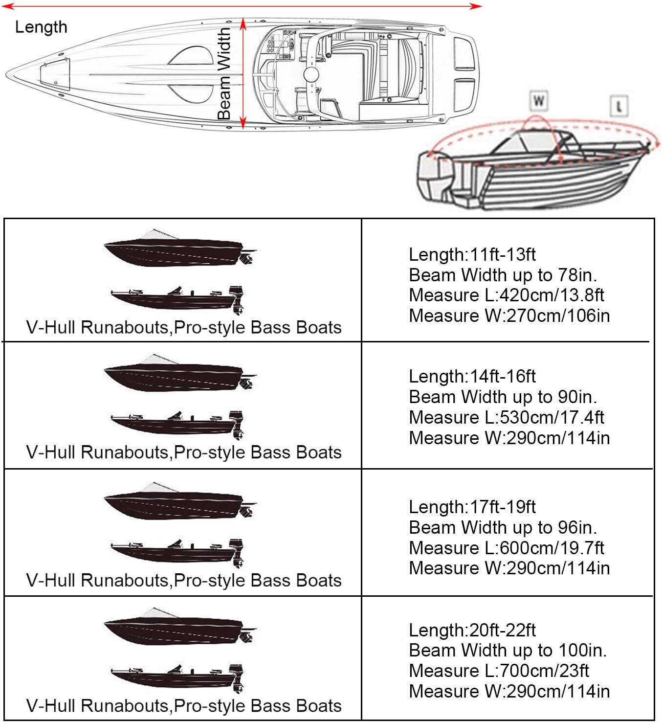 • 5 grössen: 420x270cm, 530x290cm, 600x230cm, 700x254cm, 1008x590cm, passend für die meisten V-Rumpf, Tri-Hull, Trailerable Speedboat Fishing Ski Boat. Bitte messen Sie Ihr Boot vor dem Kauf anhand der mitgelieferten Masstabelle aus, um eine geeignete