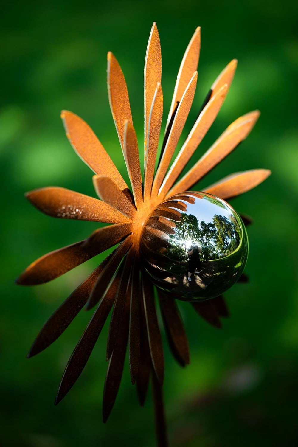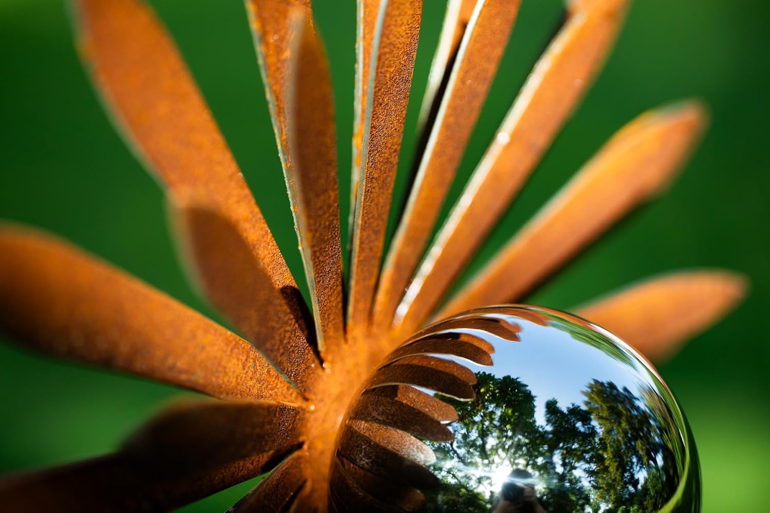 • Rostfigur für den Garten Pflanzstecker rostige Blume mit Edelstahlkugel als Geschenk Metallstecker Beetstecker Gartenfigur