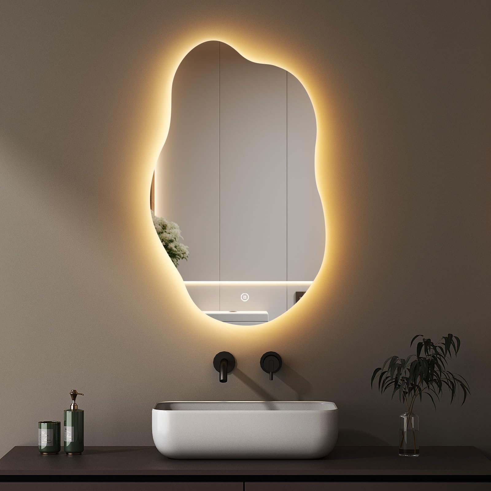 - Einzigartiger Asymmetrischer Spiegel mit Beleuchtung: Dieser Spiegel mit seiner unregelmässigen und organischen Formgebung verleiht jedem Raum eine moderne Ästhetik. Zeitloses Design ermöglicht es, der als schöne Dekoration in jeder Ecke passen kann.