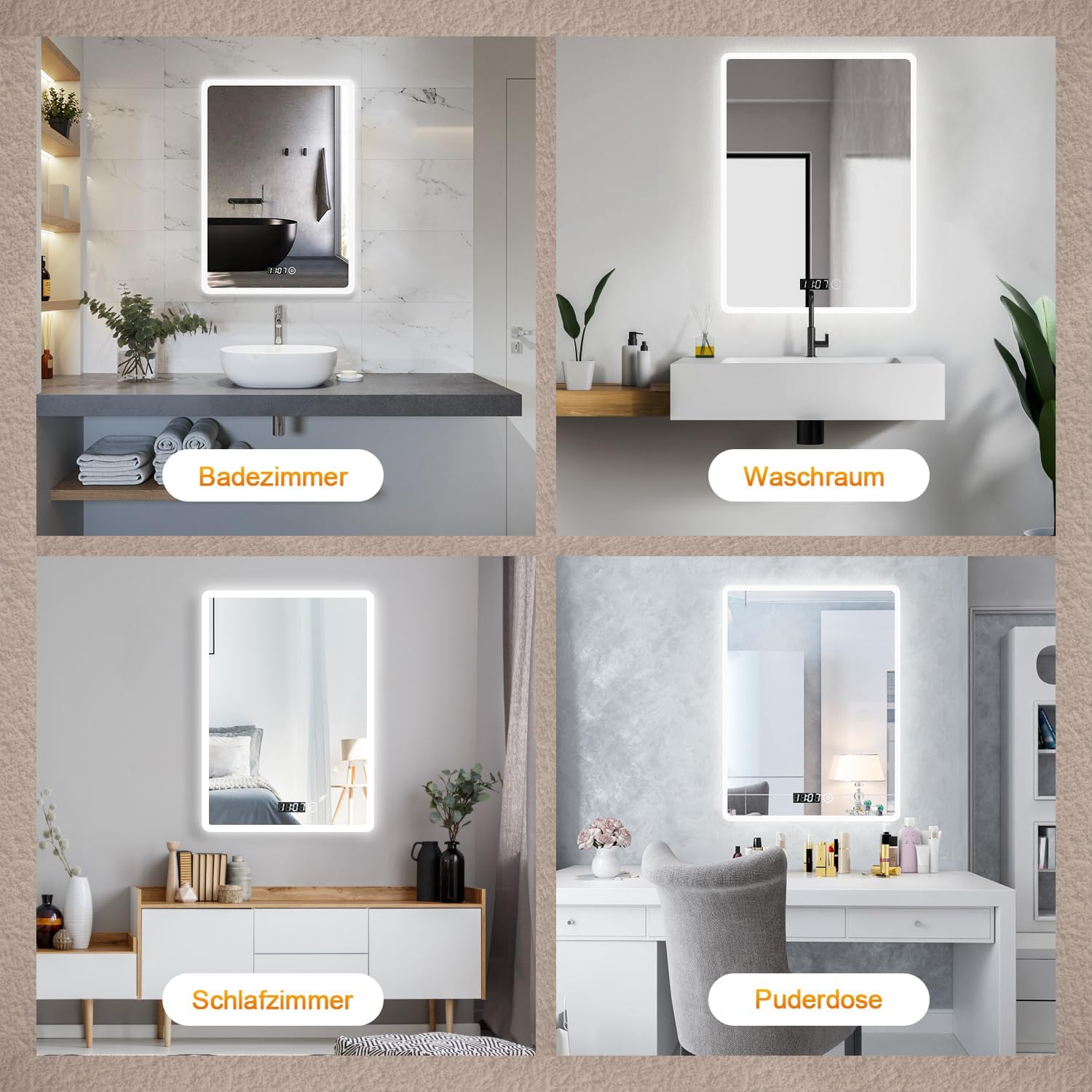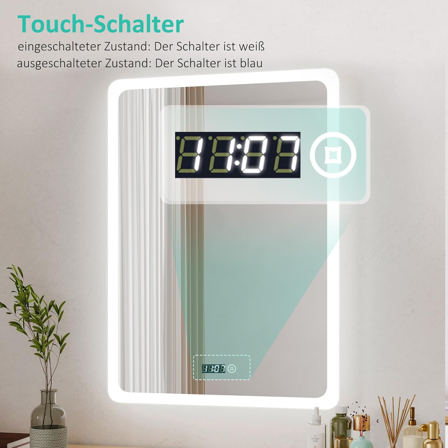 Boromal Badspiegel mit Uhr Badspiegel 50x70cm Badezimmerspiegel mit Beleuchtung 6500K Kaltweiss LED