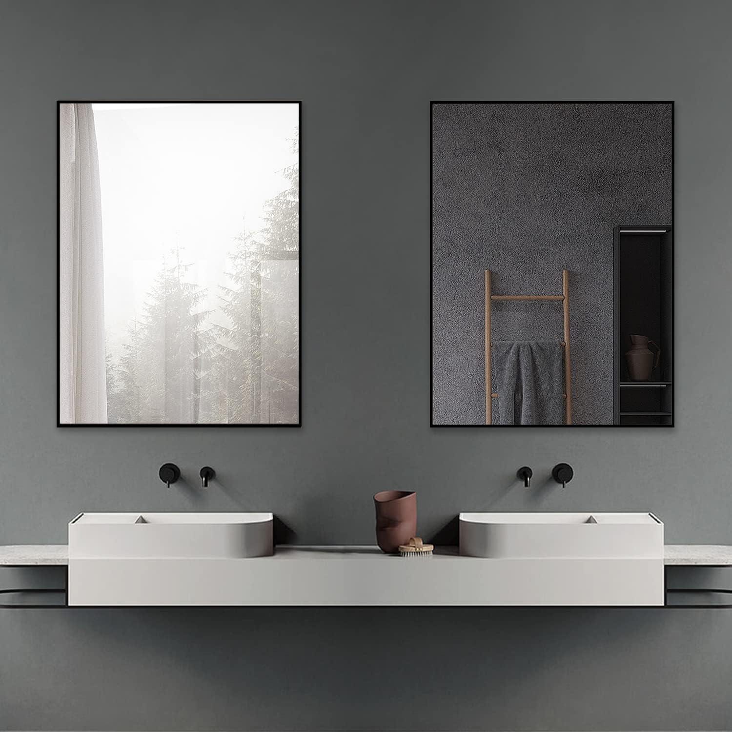 • Hochwertiger matt schwarzer Aluminiumrahmen. 5MM umweltfreundlicher kupferfreier Spiegel. Im eingebauten Zustand ist er nur 20mm von der Wand entfernt.