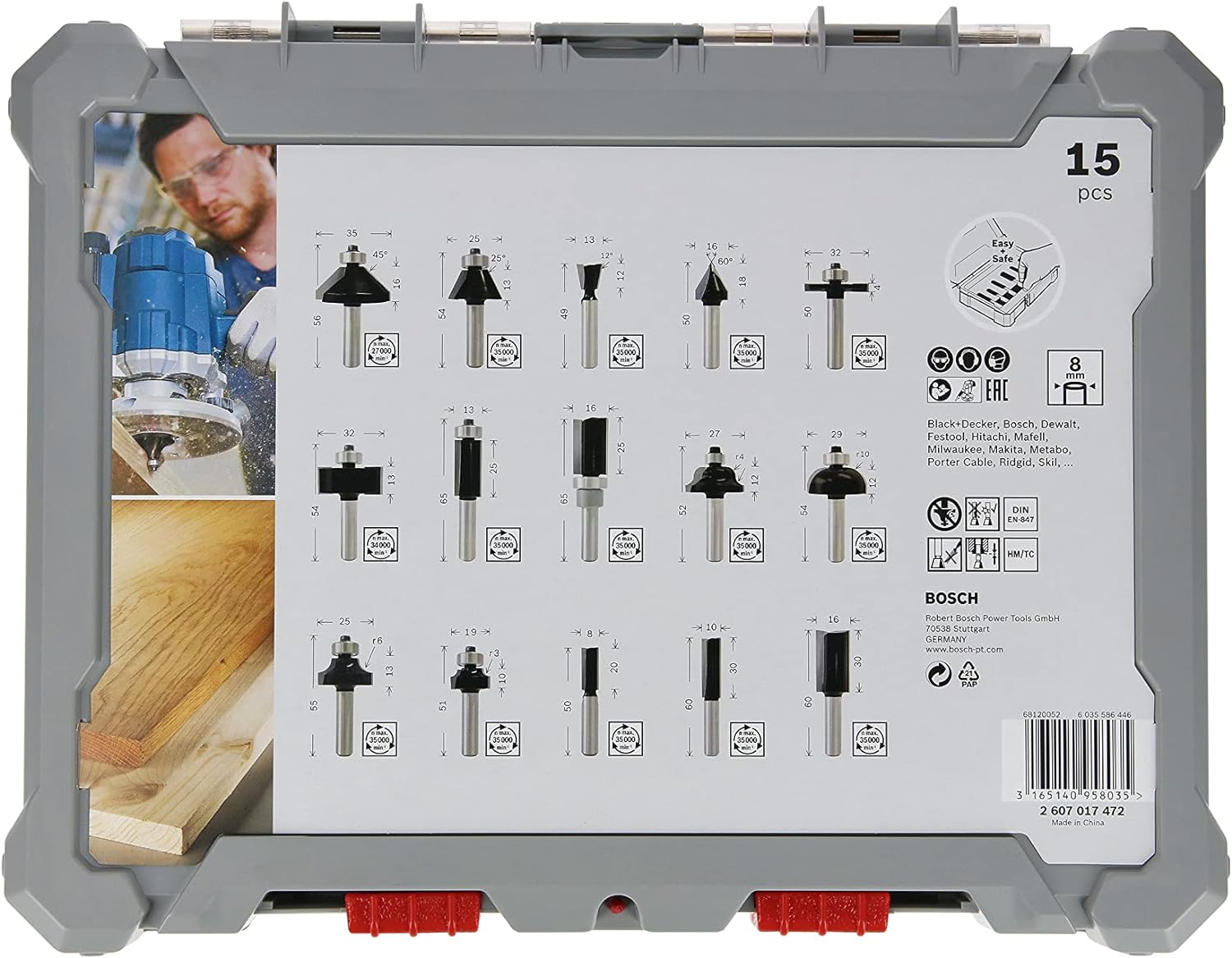 - Lieferumfang: Bündigfräser / Bündig-Profilfräser / Zinkenfräser / 2 x Fasefräser / V-Nutfräser / Scheibenfräser / Falzfräser / Römerprofilfräser / Kehlfräser / 2 x Abrundfräser / 2 x 2-schneidiger Nutfräser / 3-schneidiger Nutfräser