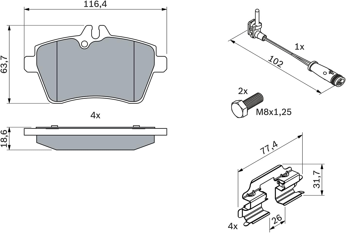 - Lieferumfang: vier Bremsbeläge pro Set, zwei Bolzen/Schrauben, vier Federn, elektrische Verschleisssensoren