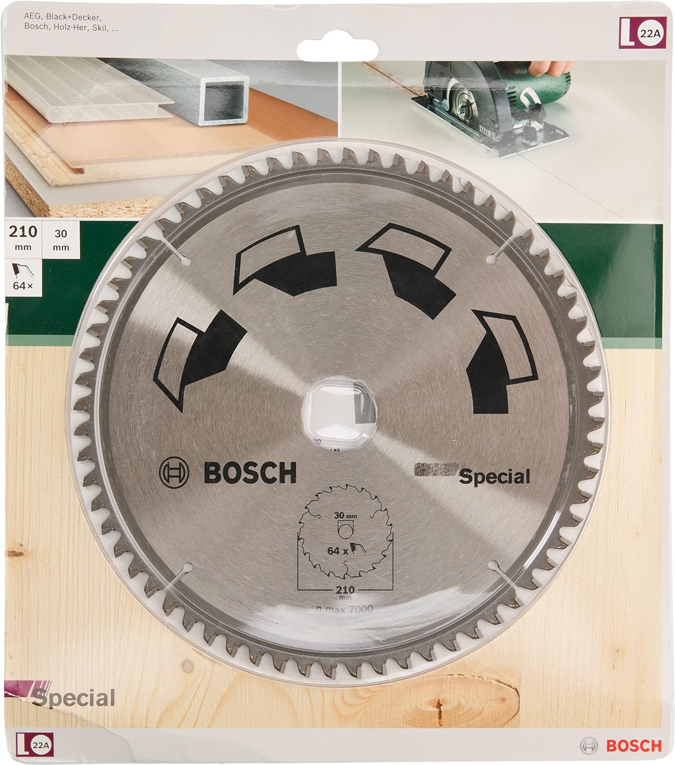 - Blattdurchmesser: 210 mm; Bohrung: 30 mm; Schnittbreite: 2,5 mm; Zähnezahl: 64
