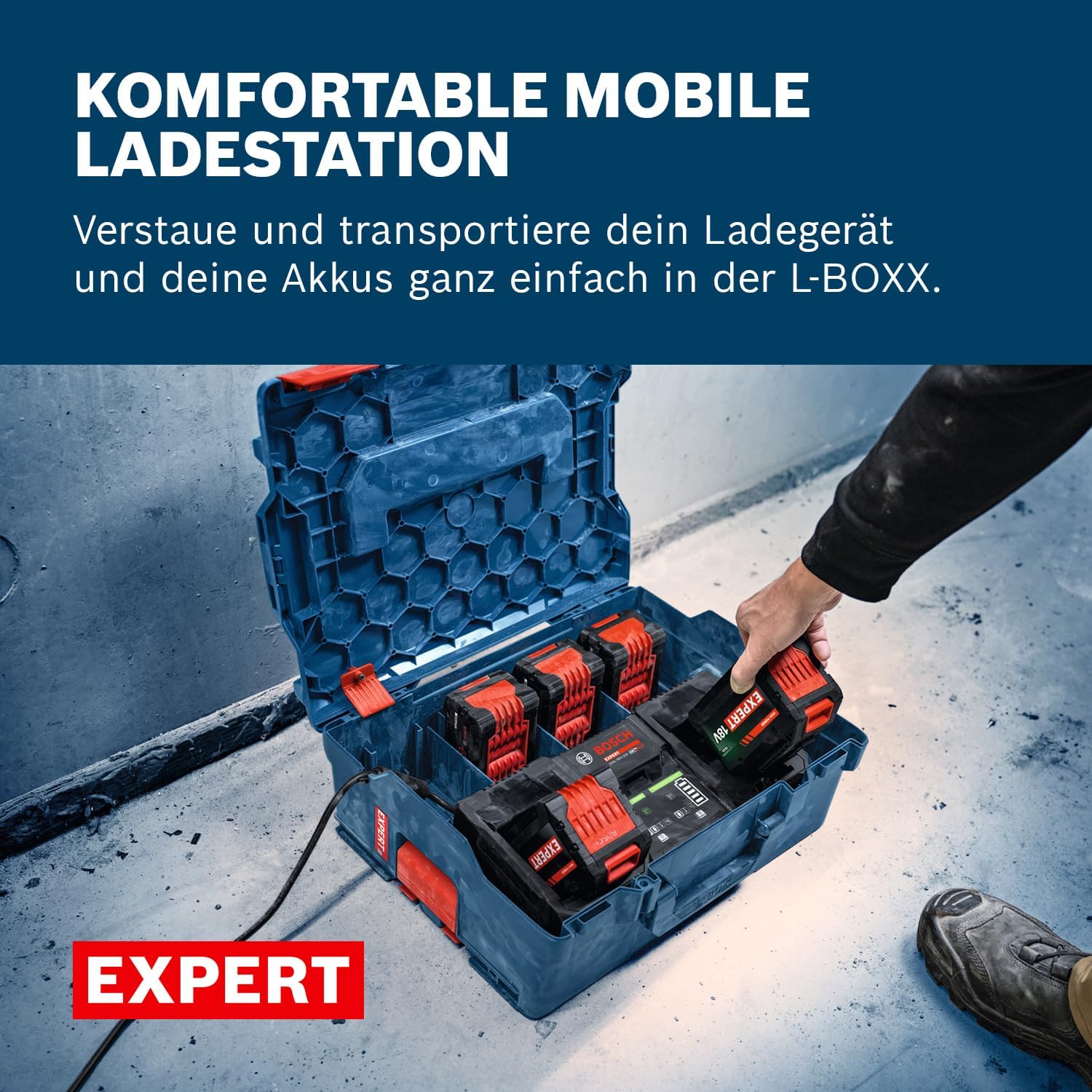 - Mobilitäts- und Aufbewahrungslösung: Bequemes Laden, Transportieren und Aufbewahren von Ladegerät und Akkus in einer speziell angepassten L-BOXX.