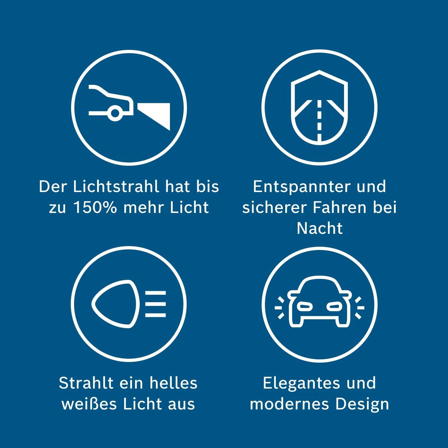 - Leistungsstark: Ein Lichtstrahl, der bis zu 150 % mehr Licht auf die Strasse bringt als herkömmliche Halogen-Lampen - zur frühzeitigen Erkennung von Fahrbahnmarkierungen, Verkehrszeichen und Gefahrenquellen