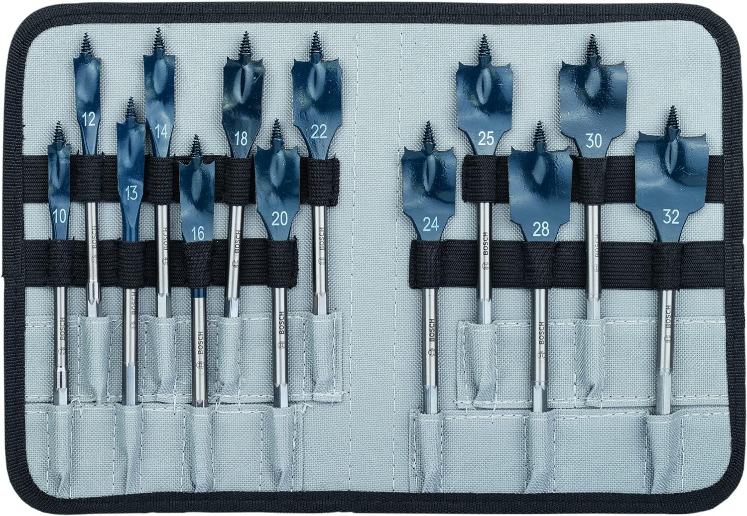 - Lieferumfang: 13x SelfCut Flachfräsbohrer Ø 10/12/13/14/16/18/20/22/25/28/30/32 mm, 1x Rolltasche