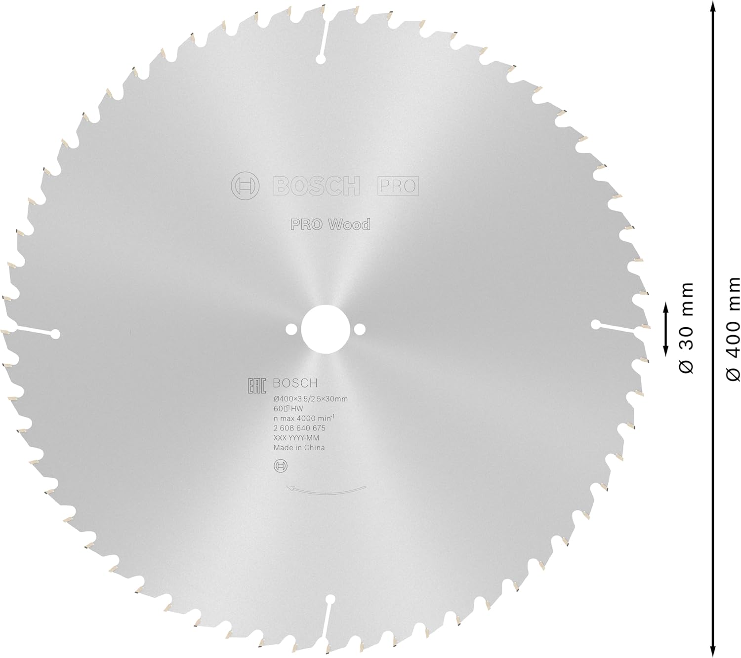 - Aussendurchmesser: 400 mm, Bohrung: 30 mm, Schnittbreite: 3,5 mm, Stammblattstärke: 2,5 mm, Zähnezahl: 60