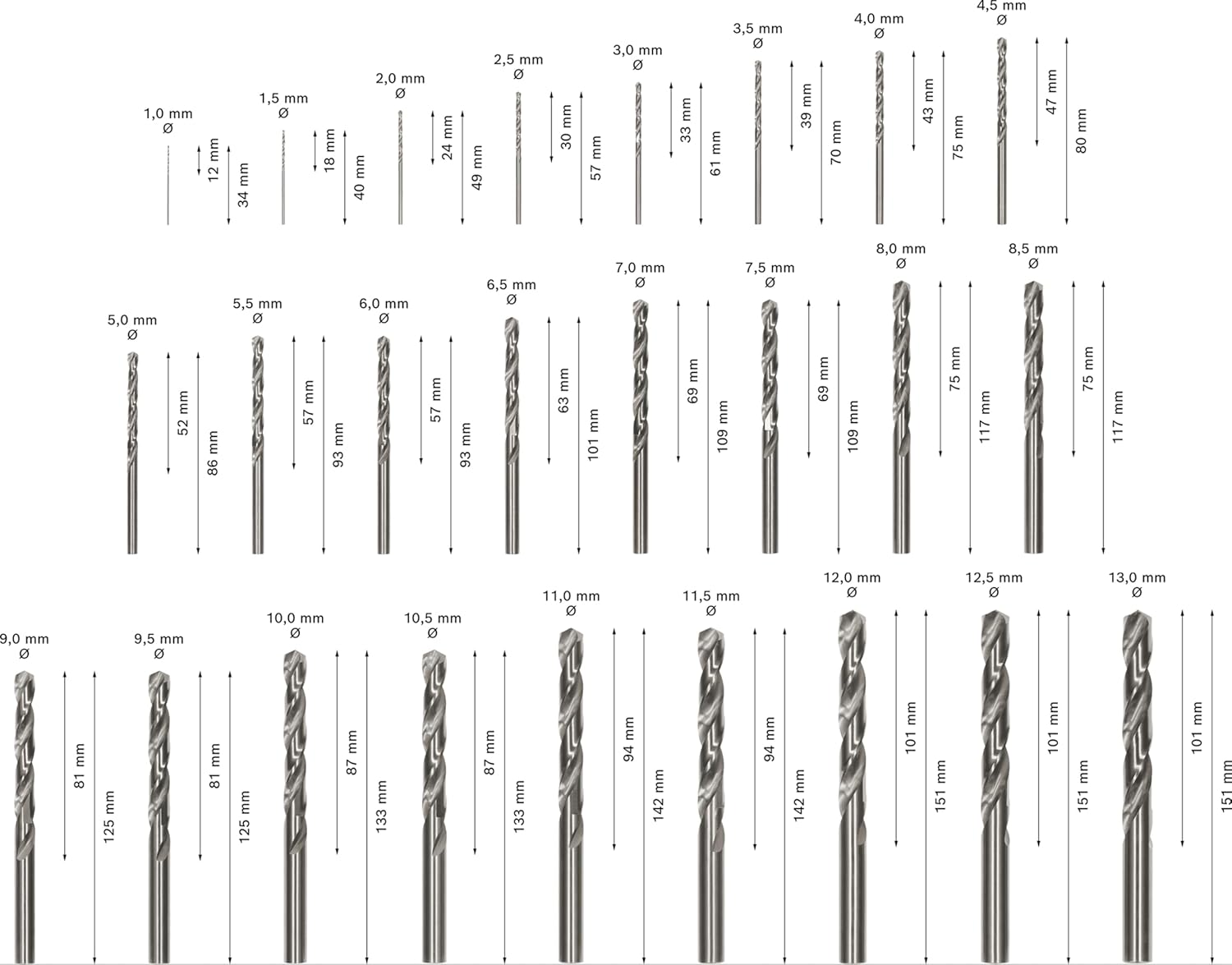 - Lieferumfang: 25 x Bosch Professional HSS-G Spiralbohrer für Stahl - Ø 1/1.5/2/2.5/3/3.5/4/4.5/5/5.5/6/6.5/7/7.5/8/8.5/9/9.5/10/10.5/11/11.5/12/12.5/13 mm