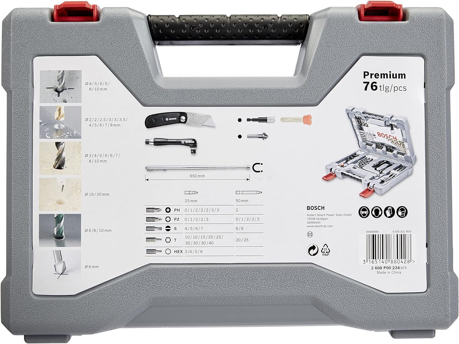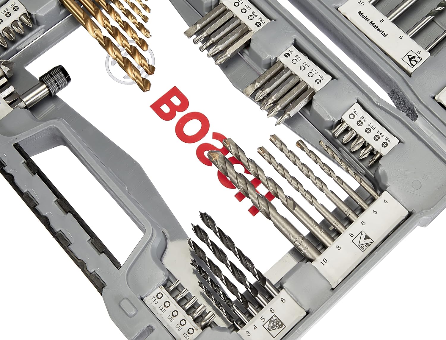 - Lieferumfang:11x HSS-TiN-Spiralbohrer Ø 2-8 mm,6x CYL-3 Steinbohrer Ø 4/5/6/6/8/10 mm, 8x Holzbohrer Ø 3/4/5/6/6/7/8/10 mm, 2x Flachfräsbohrer 16/20 mm,3x CYL-4 MultiPurpose Bohrer Ø 6/8/10 mm,29x Schrauberbits25mm:7x Kreuzschlitz PH 0/1/2/3,