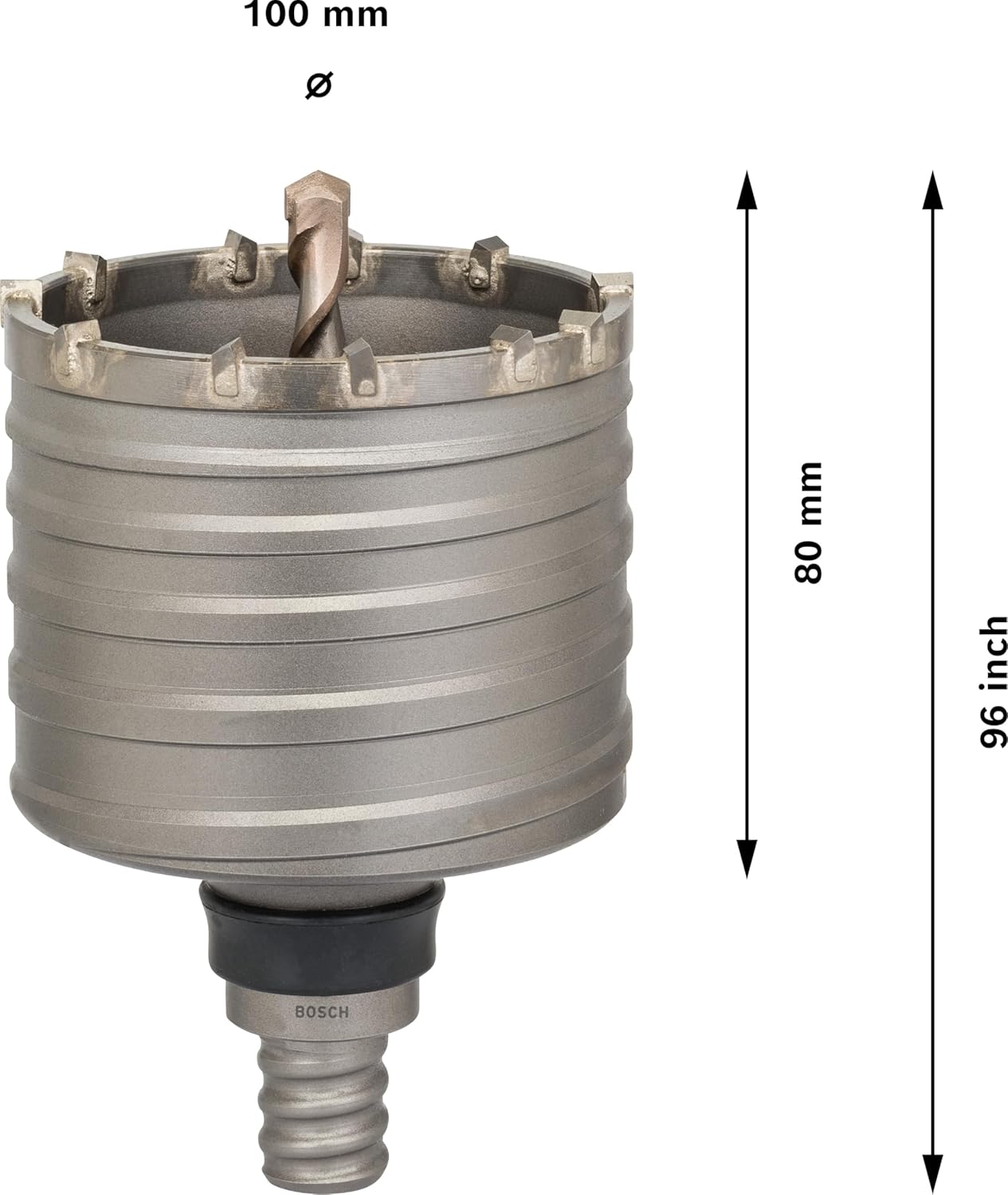 - 11 asymmetrische Hartmetall-Zähne für aggressiven Arbeitsfortschritt bei gleichzeitig hoher Laufruhe. Der Langschaft ermöglicht Durchbruchbohren.