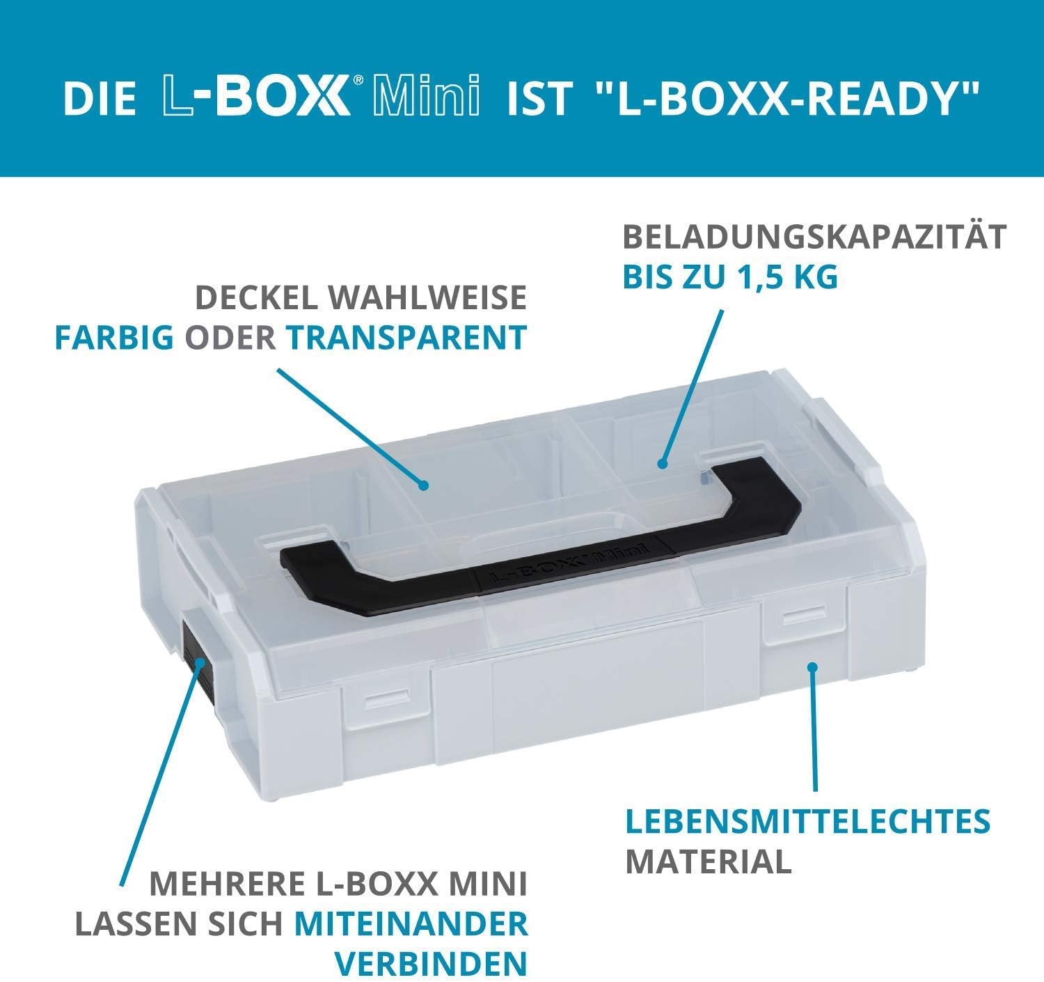 - ✅ ÜBERSICHTLICH – Durch den optionalen transparenten Deckel haben Sie schnelle Übersicht über Füllstände und Inhalt der L-BOXX Mini ohne dabei den Deckel öffnen zu müssen