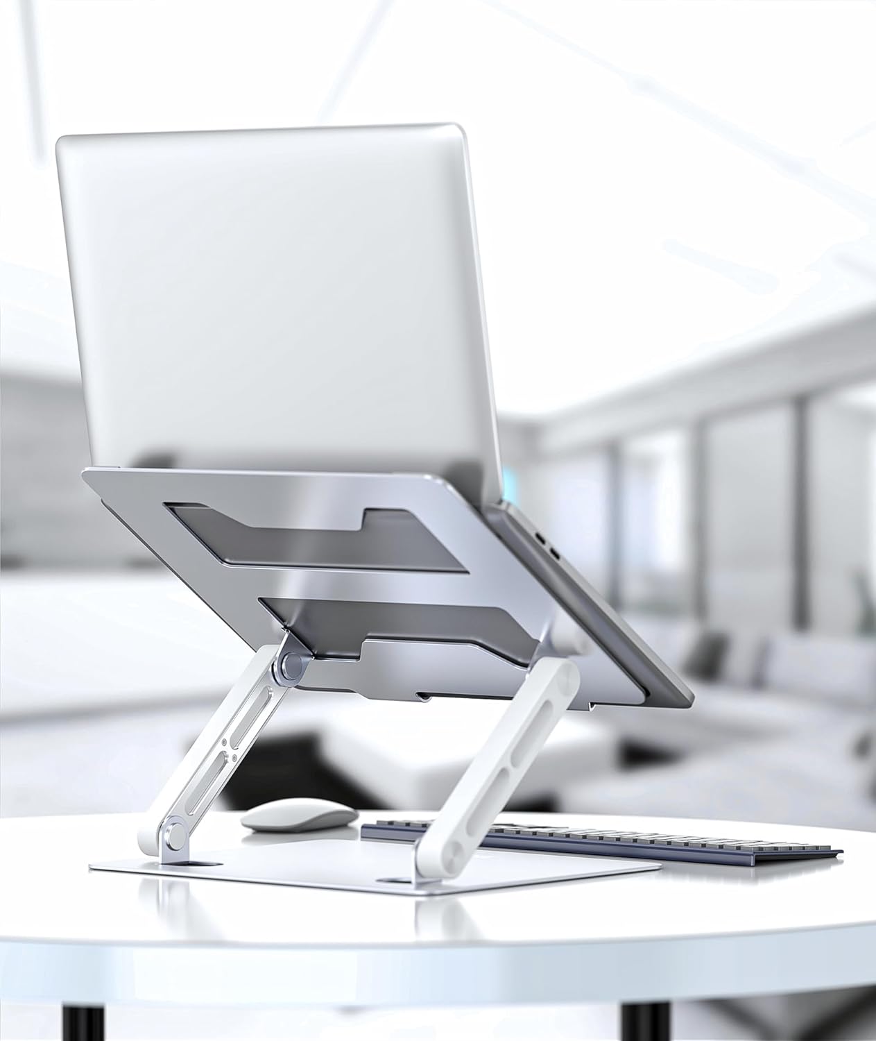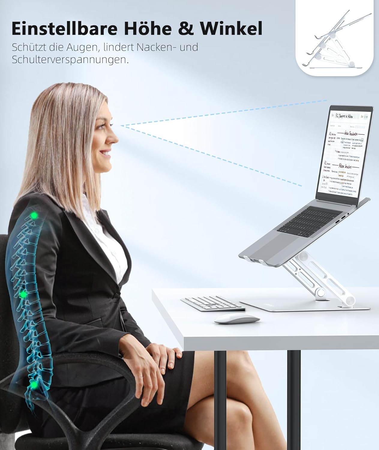 - [Höhen & Winkelverstellung]: Der Laptop Ständer Höhenverstellbar ermöglicht es Ihnen, sowohl Höhe als auch Winkel individuell anzupassen, um optimalen Komfort zu erreichen. Schützen Sie Ihre Augen, lindern Sie Nacken- und Schulterverspannungen und