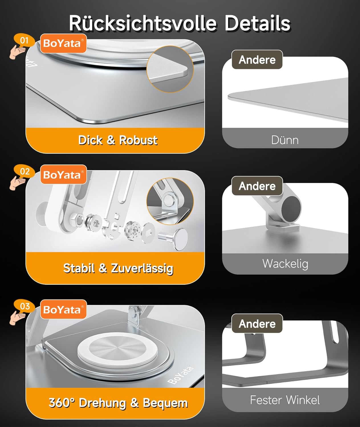 - 360° Drehbares Design: Der Laptop Ständer höhenverstellbar verfügt über einen 360° drehbaren Sockel, mit dem Sie den Laptop mit einer Hand einfach horizontal drehen und in die gewünschte Richtung fixieren können. Die drehbarer Computer Ständer