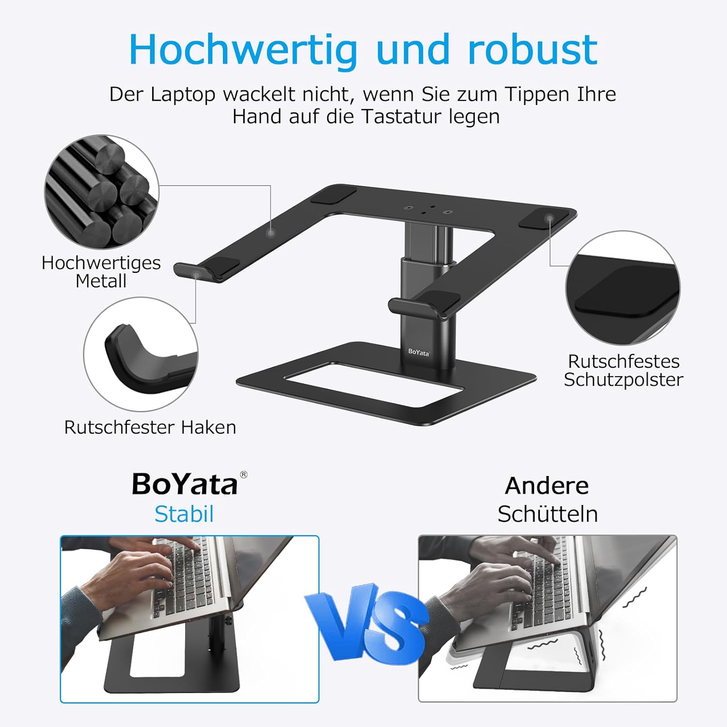 - 【VOLL ERGONOMISCH】Mit dem BoYata-Laptopständer können Sie Ihren Laptop in eine perfekte Desktop-Workstation verwandeln. Reduziert die Belastung von Nacken und Rücken, die durch stundenlanges Sitzen am Schreibtisch entsteht.