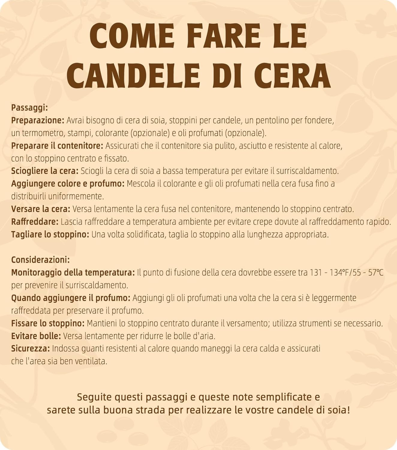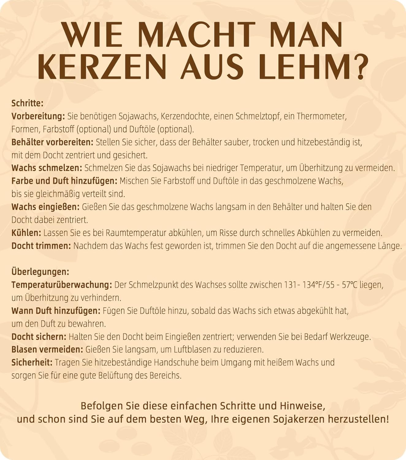 - [ Für Anfänger und Experten ] Easy to make step by step for beginners and experts, First measure out the wax, flavour and/or colour, then heat the wax to 55-70°C, pour into container or mould.
