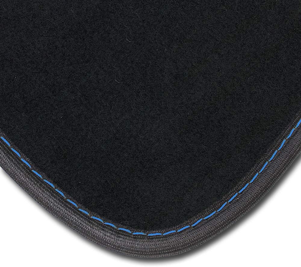 - MATERIAL & DESIGN - Hochwertiger, pflegeleichter und robuster Tuft-Velours mit Bandeinfassung Schwarz und Ziernaht Blau. Zusätzlicher Stick auf Fahrermatte in den Farben Blau & Weiss (Schriftzug / Logo: EXCLUSIVE LINE)