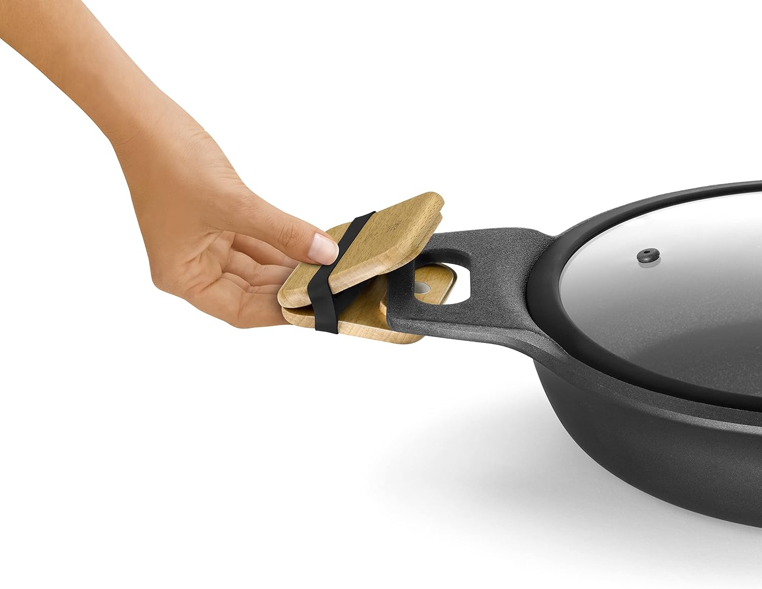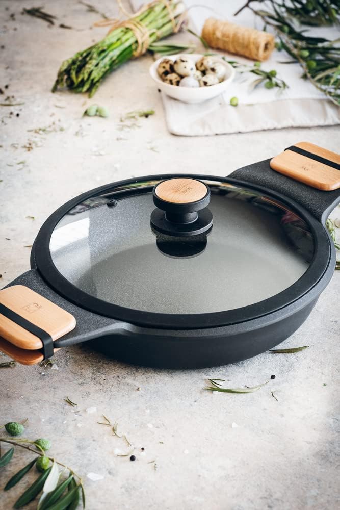 - Es enthält zwei Holzgriffe, um die Pfanne bequem zu halten, und einen Glasdeckel mit Silikonrand zum optimalen Schliessen.Das Holz ist vom FSC (Forest Stewardship Council) zertifiziert, was uns versichert, dass es sich um kontrolliertes Holz handelt,