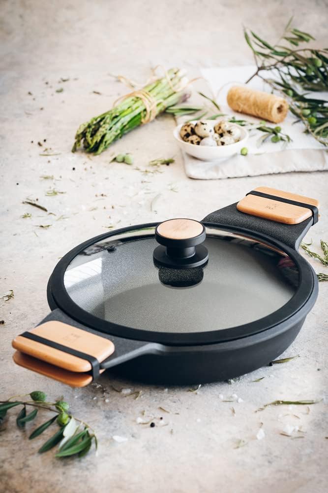 - Es enthält zwei Holzgriffe, um die Pfanne bequem zu halten, und einen Glasdeckel mit Silikonrand zum optimalen Schliessen.Das Holz ist vom FSC (Forest Stewardship Council) zertifiziert, was uns versichert, dass es sich um kontrolliertes Holz handelt,