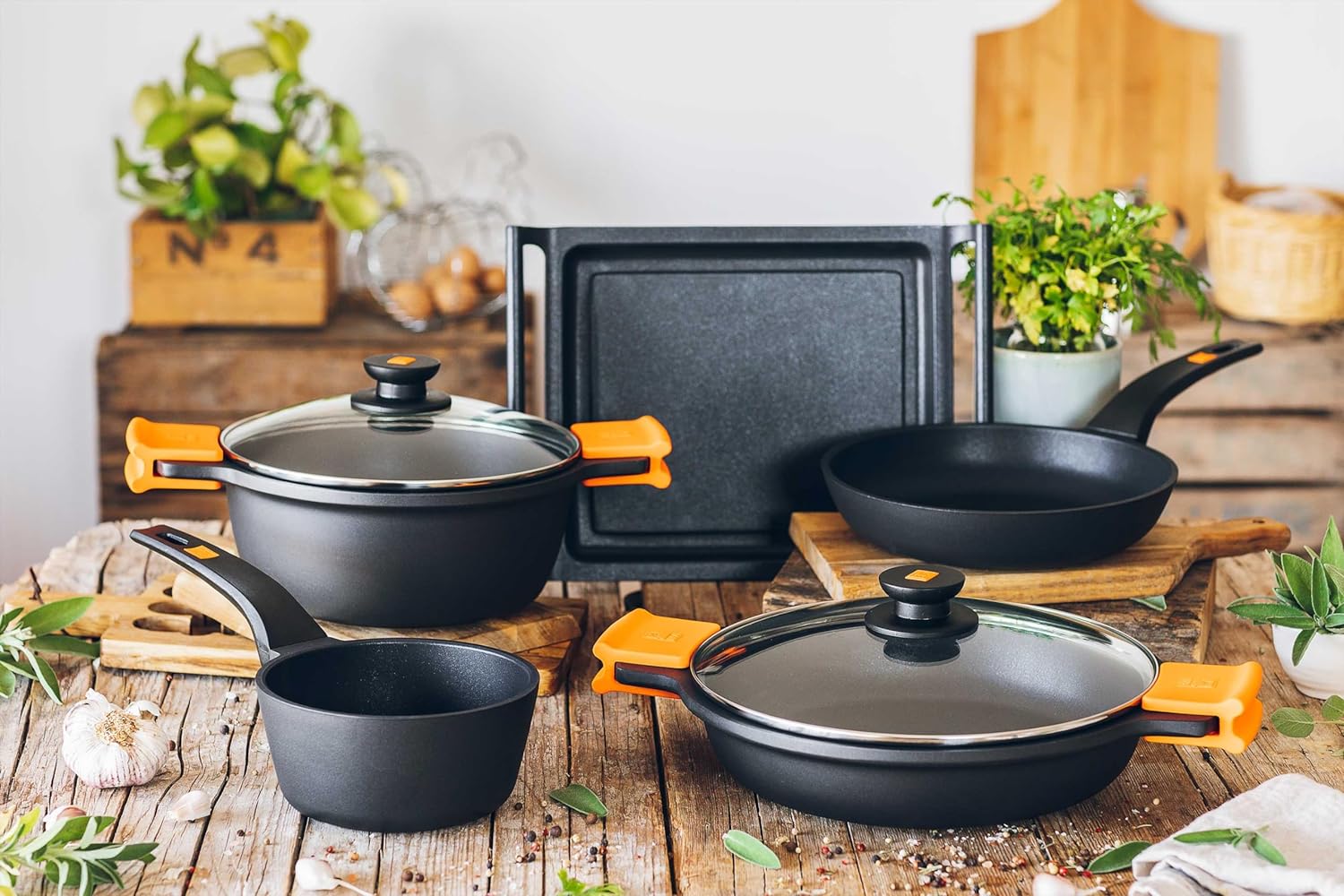 - Abnehmbare hitzebeständige Silikone im Lieferumfang enthalten. Entdecken Sie, wie Sie Ihr antihaftbeschichtetes Kochgeschirr in der Bedienungsanleitung auf dieser Karte pflegen können