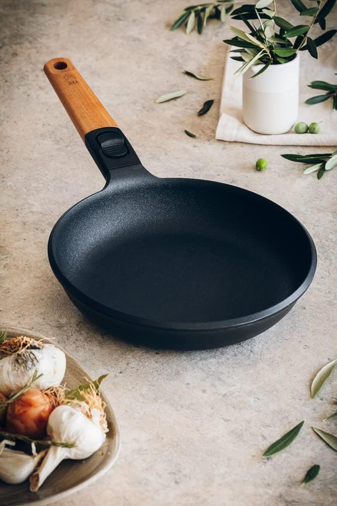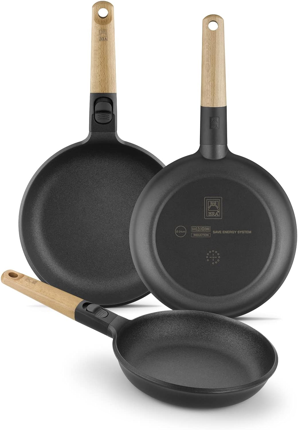 BRA MARKET Bratpfanne, 24 cm, Aluminiumguss, abnehmbarer Griff aus Naturholz, dreilagig, PFOA-frei,
